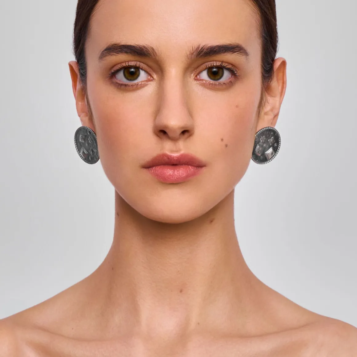 Kolczyki w kształcie medalionów to świetna baza do stworzenia wielu stylizacji zarówno codziennych, jak i bardziej odświętnych. Dobrze wyglądają solo, ale jeszcze lepiej prezentują się w duecie z amuletnicą na sznurze lśniących labradorytów. Śmiało łącz kolczyki z biżuterią z innych kolekcji: subtelną obrączką z lapisem lazuli z kolekcji Orini, która doda odrobiny koloru lub oksydowanym naszyjnikiem z meteorytem Aletai. Stylizację dopełni pin w kształcie oka z kolekcji Semios. A na specjalne okazje dobrym towarzyszem dla kolczyków, będzie okazały srebrny naszyjnik w kształcie medalionu.