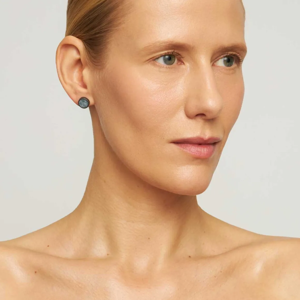 Kolczyki z kolekcji Maroko zostały wykonane ręcznie z oksydowanego srebra. W centrum okrągłych ram umieszczono gładki, okrągły akwamaryn w błękitnym odcieniu. Grafitowa oprawa ze srebra kontrastuje z jasnym odcieniem kamienia, podkreślając inkluzje widoczne wewnątrz każdej bryłki. Kolczyki zapinane są na wygodny sztyft, dzięki czemu są lekkie i idealne do noszenia przez cały dzień. Ich niewielki rozmiar sprawia, że są uniwersalne – pasują zarówno do casualowych, jak i bardziej eleganckich stylizacji.