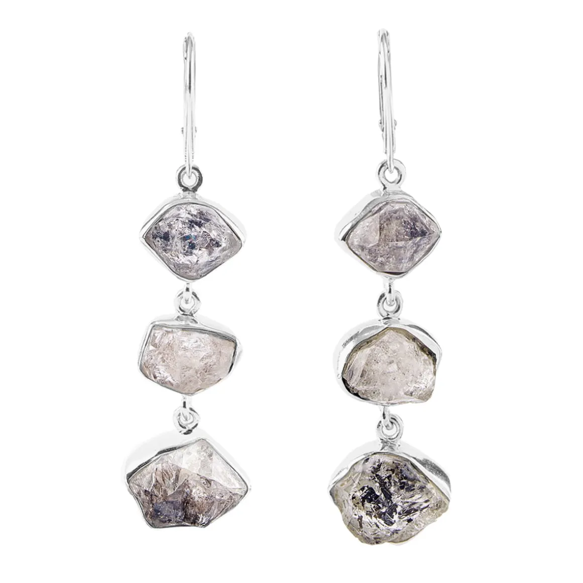 Wiszące kolczyki na zapięciu typu bigiel angielski zostały wykonane ze srebra próby 925 i naturalnych kamieni: herkimerów. Ten kryształ górski o transparentnej barwie zachwyca surową strukturą, nieregularną formą i barwnymi inkluzjami, które dodają mu charakteru. Kamienne bryłki zostały indywidualnie oprawione w srebro, by podkreślić nieregularny, pierwotny kształt kamienia. To wyjątkowe podejście wyróżnia kolekcję, bo w jubilerstwie zazwyczaj stosuje się ustandaryzowane oprawki. Każdy kolczyk tworzą trzy kamienie zawieszone jeden pod drugim. Herkimery delikatnie różnią się wielkością, kształtem i fakturą, dlatego każda para kolczyków jest unikatowa.