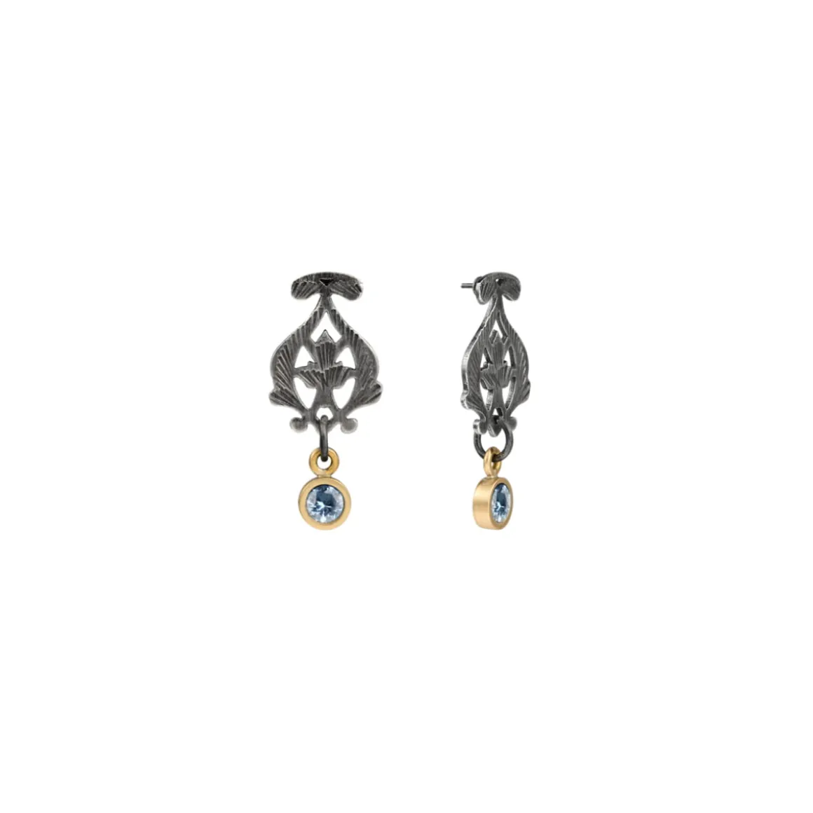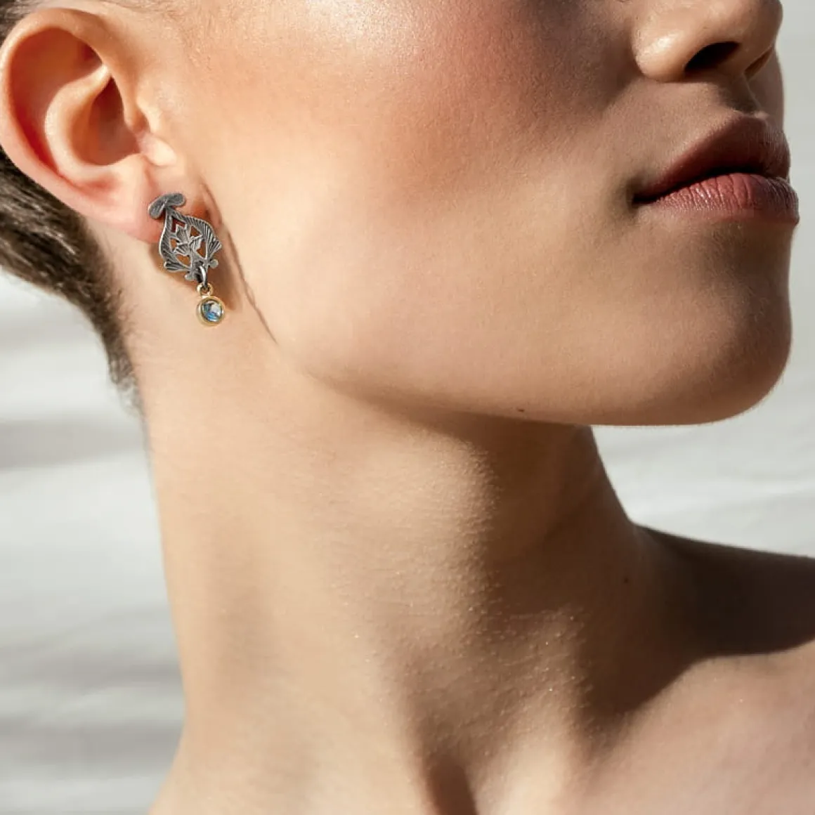 Kolczyki zostały wykonane ręcznie ze srebra w marokańskim warsztacie. Mistrzowie z Marrakeszu wycięli misterny kształt i nadali mu koronkową strukturę. Floralny wzór zaczerpnięty został z tradycyjnych marokańskich lamp, które zgodnie z tradycją islamu, bogato zdobione są kwiatami, liśćmi lub finezyjnie przenikającymi się pnączami. Chcąc podkreślić grę światłocienia, w warsztacie ORSKA symetryczne kolczyki dodatkowo zostały oksydowane, a mosiężne, wiszące oprawki udekorowano cyrkonią w kolorze morskiego błękitu.
