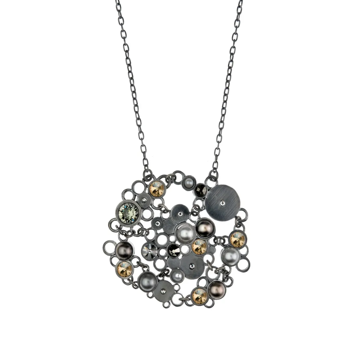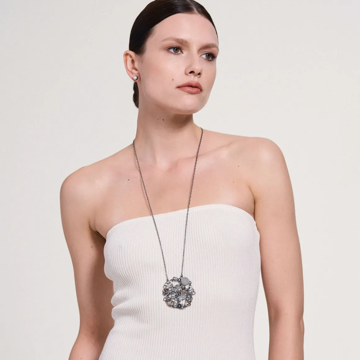 Kolekcja Soda to dyskretny flirt klasyki z nowoczesnością. Tradycyjna elegancja pereł została subtelnie przełamana współczesnymi kryształami, osadzonymi w srebrnych elementach wykonanych w technologii druku 3D. Delikatny urok ciemnych pereł, rozświetlony kryształami Swarovski Elements, współgra z grafitową szarością metalu. Artystyczny naszyjnik na długim łańcuszku został wykonany ręcznie. Efektowna biżuteria będzie idealną ozdobą dla wielbicieli nieoczywistych rozwiązań, spragnionych unikalnych doznań estetycznych.