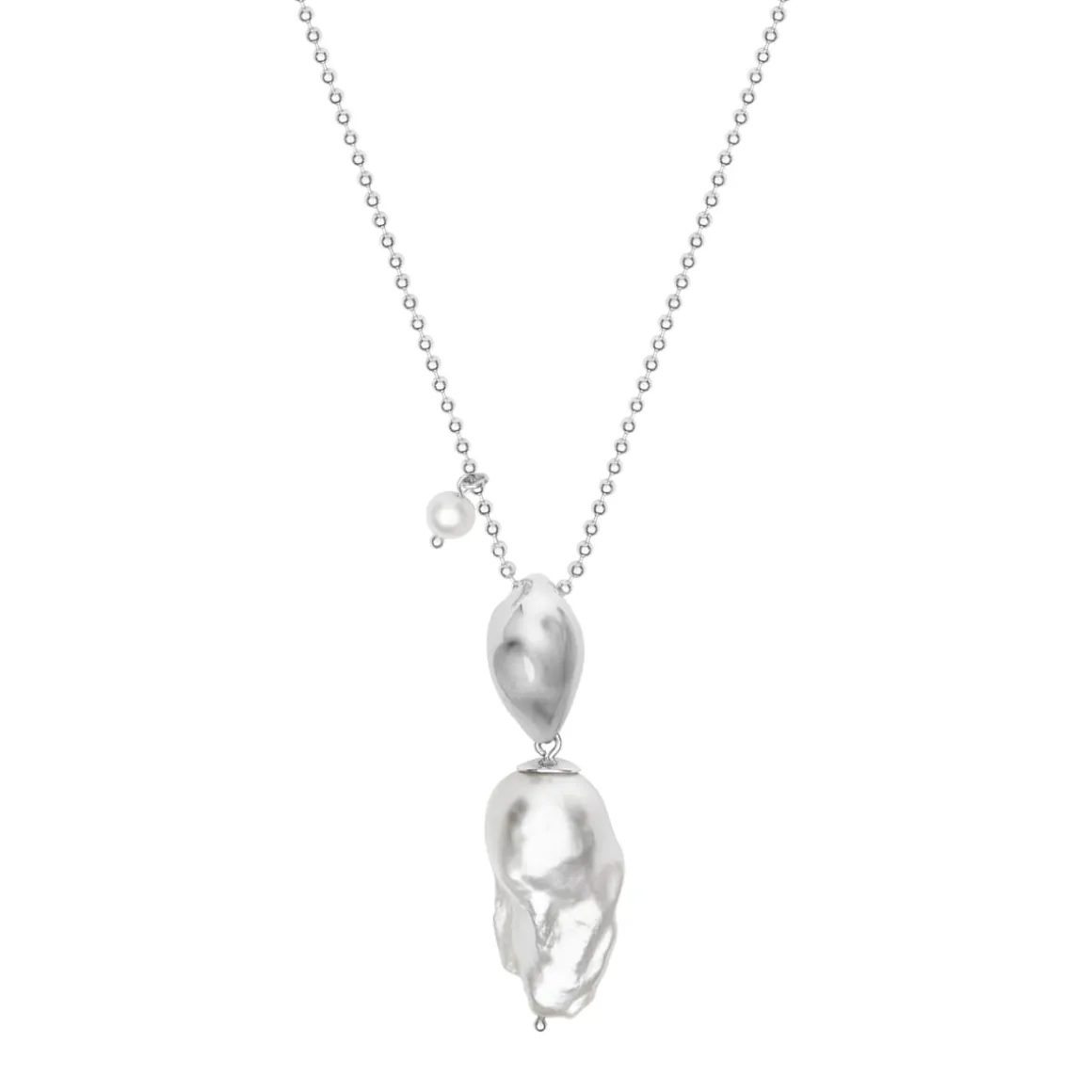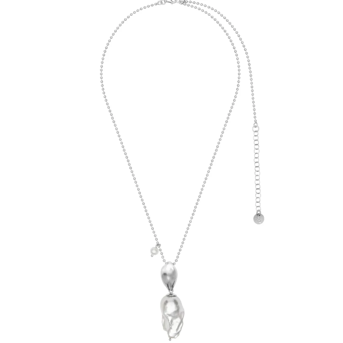 Naszyjnik wykonany został z jasnego srebra próby 925. Na długim łańcuszku o kulkowym splocie zawieszono dużą, efektowną zawieszkę, która jako pierwsza przyciąga wzrok i stanowi centralny punkt całej kompozycji. Górna część zawieszki kształtem przypomina nieregularną perłę, została jednak wykonana z jasnego srebra próby 925. Jej płynna, asymetryczna forma nawiązuje do barokowego kształtu prawdziwych pereł. Do niej przytwierdzono dużą perłę, której powierzchnia pokryta jest charakterystycznymi wypukłościami i załamaniami. Każda zawieszka jest inna, ponieważ nie ma dwóch takich samych pereł. Mogą różnić się kształtem, rozmiarem i odcieniem.
