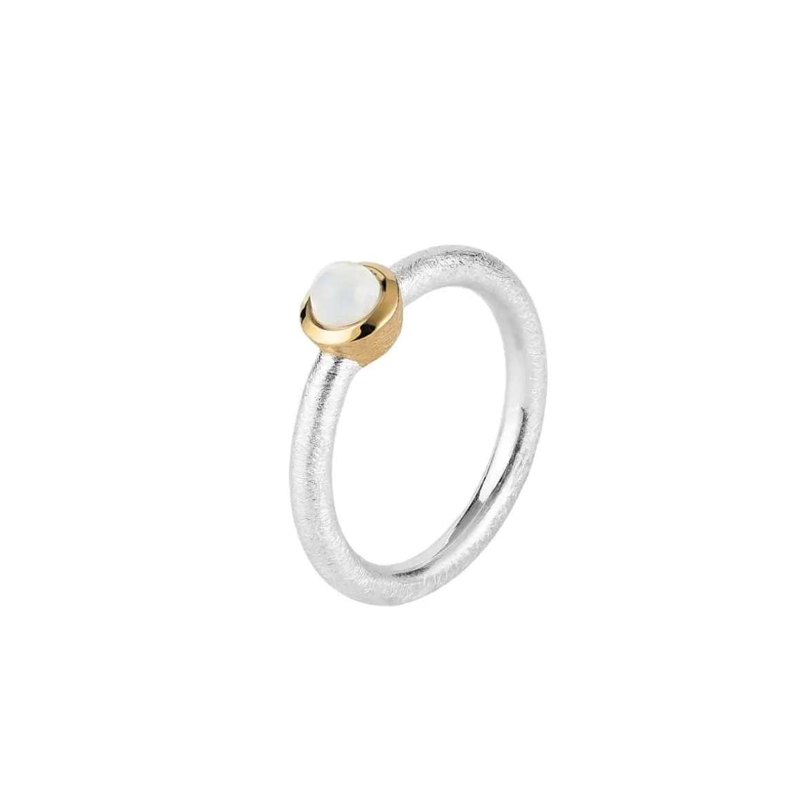 Pierścionek z kamieniem księżycowym został wykonany ręcznie z dbałością o najmniejszy szczegół. Cienką obrączkę ozdobiono pozłacaną koroną, w której umieszczono delikatnie opalizujący kamień księżycowy. Szczotkowanie srebrnej obrączki nadało jej ciekawy wygląd, a dzięki zastosowaniu jednocześnie koloru złotego i srebrnego pierścionki doskonale sprawdzą się w zestawieniu z biżuterią w obu tych kolorach. Kamień księżycowy zachwyca blaskiem i perłową poświatą. Wygodny i ergonomiczny pierścionek pasuje zarówno do codziennych stylizacji, jak i tych na specjalne okazje. Z delikatnym, diamentowym naszyjnikiem lub bransoletką stworzą duet, który skradnie każde spojrzenie. Oryginalny pierścionek świetnie odnajdzie się w roli również pierścionka zaręczynowego.