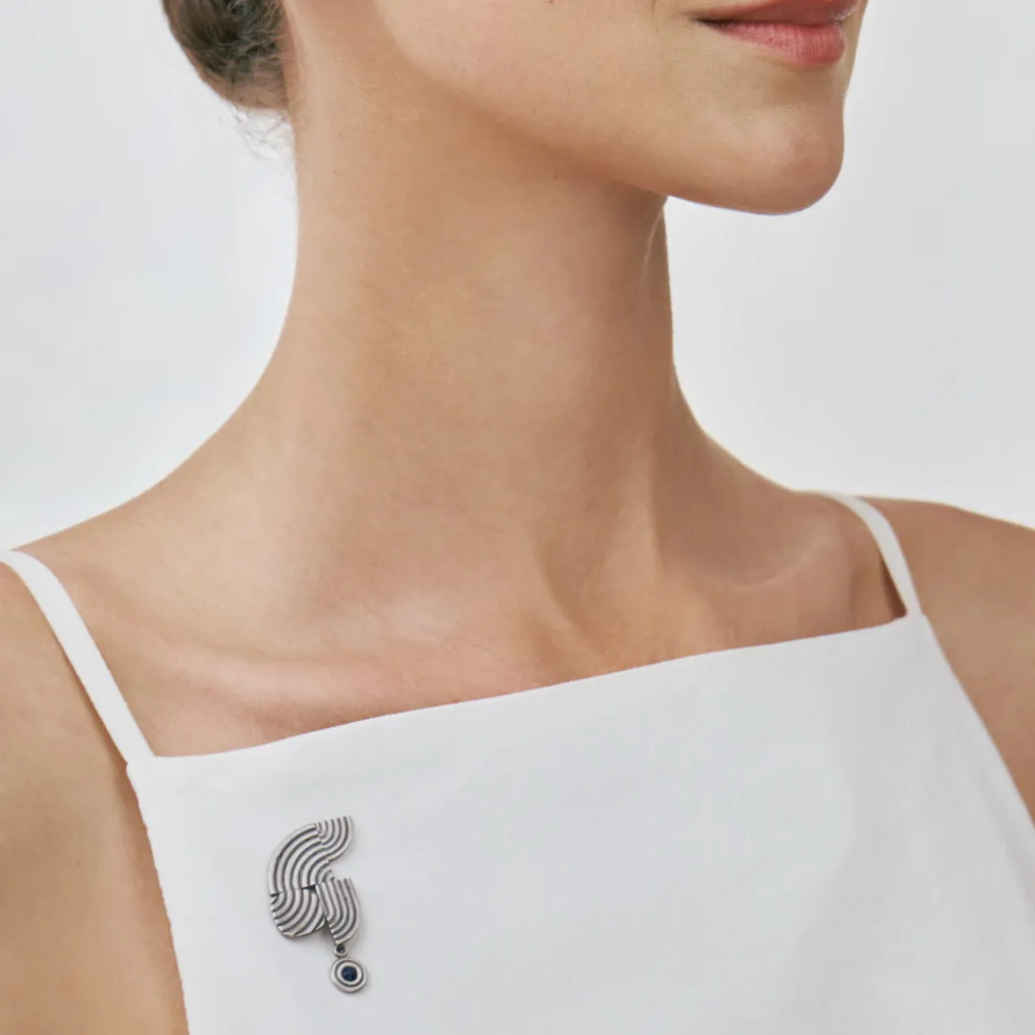 Ludzkie życie zaczyna się i kończy na oddechu. W niektórych miejscach wierzy się, że dusza wchodzi w człowieka wraz z pierwszym oddechem. W naturze powietrze towarzyszy nam w sposób namacalny w postaci wiatru. Jest symbolem kreatywności i uważności. W pracowni ORSKA przełożyliśmy moc żywiołu powietrza na elegancką przypinkę. Pin z kolekcji Holos został odlany ze srebra, a następnie oksydowany. Ten zabieg nadał mu oryginalny, grafitowy kolor. Cztery jego części zostały złożone ze srebrnych pręcików. Dynamiczne linie zmieniają kierunek naśladując kształtem nieustannie pędzący łuk powietrza. Kompozycję uzupełnia kryształ o błękitnej barwie.