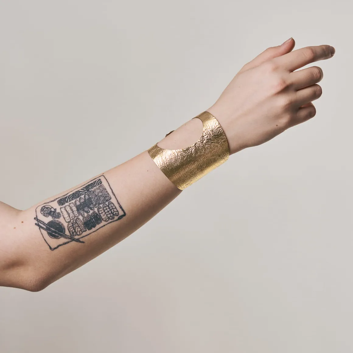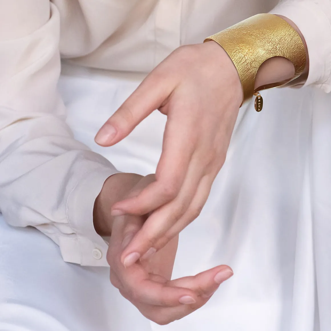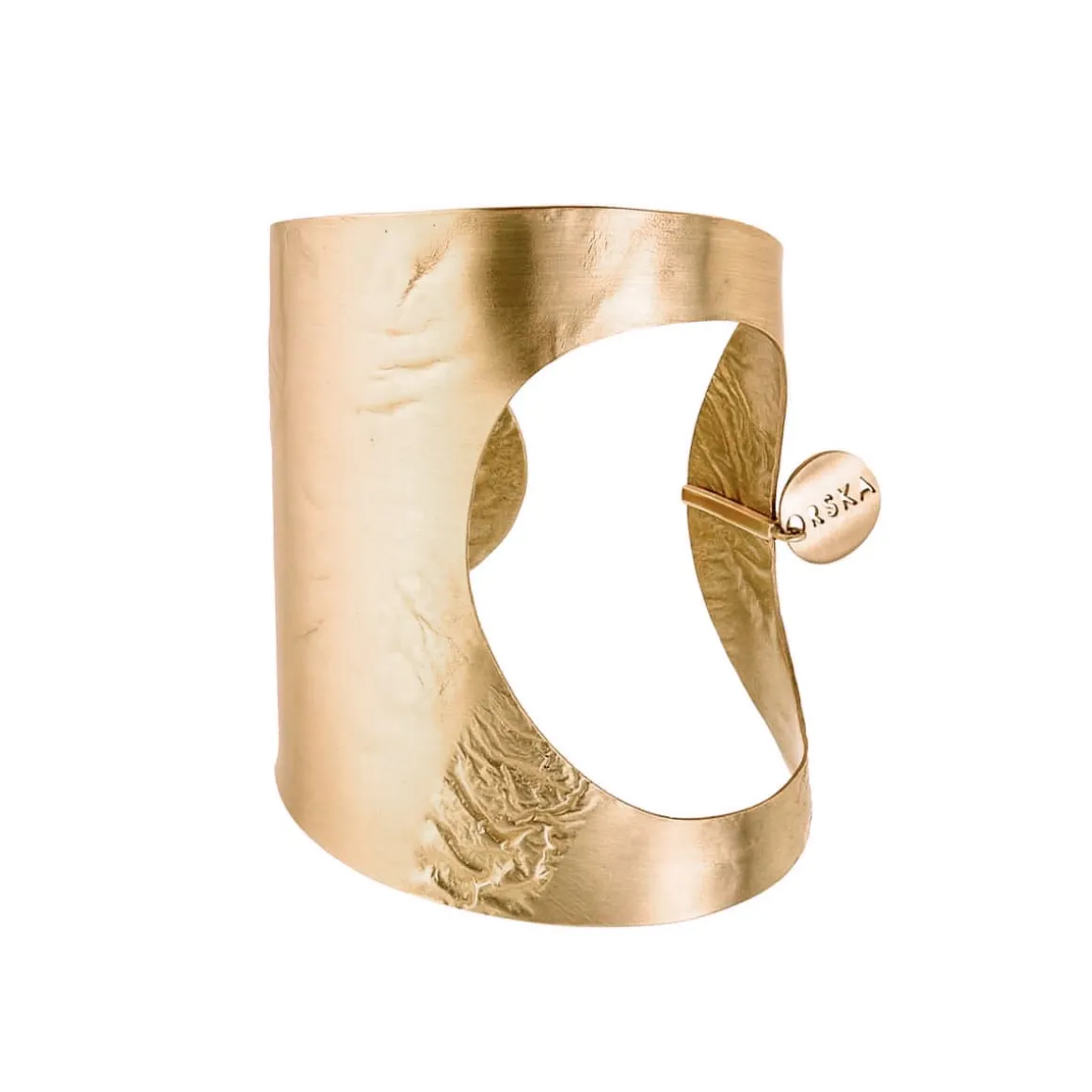 Artystyczna, sztywna bransoletka z kolekcji Moon została ręcznie wykonana z pozłacanego mosiądzu. Owalna płaszczyzna, pod wpływem wysokiej temperatury, przyjęła niepowtarzalną strukturę zagięć, która przywodzi na myśl krajobraz księżycowy. Powierzchnia szerokiego mankietu posiada satynowe wykończenie. Bransoletkę zdobi okazałe wycięcie z boku, które dodaje lekkości całej efektownej konstrukcji. Oryginalny design najlepiej prezentuje się w towarzystwie innych wzorów z tej samej kolekcji. Pozostaje więc tylko wybrać wielkość konstelacji, aby stworzyć własny Układ Słoneczny.