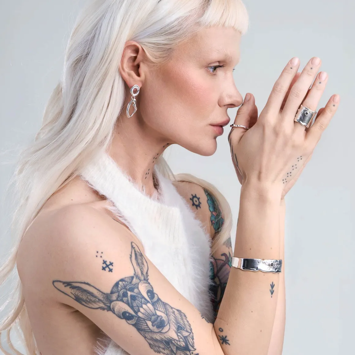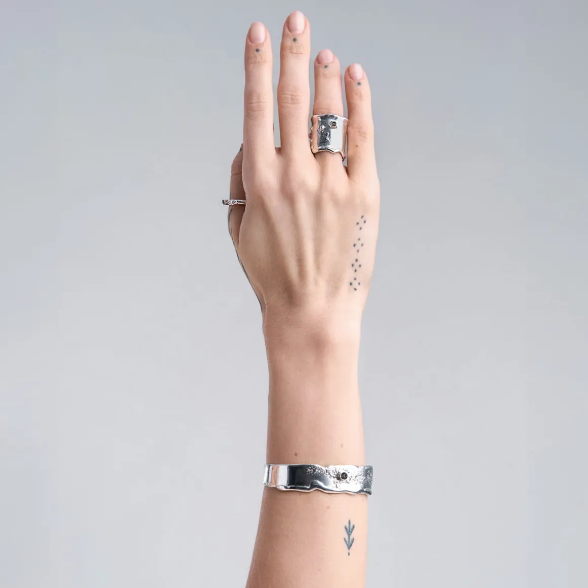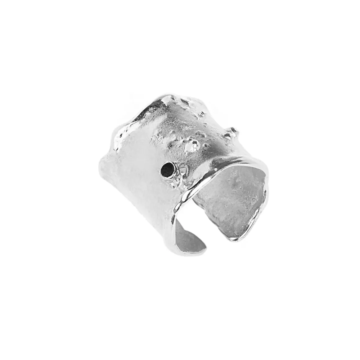 Szeroka, otwarta obrączka została wykonana ręcznie ze srebra. Jako pierwsza uwagę przykuwa nieregularna forma obrączki. Powierzchnia srebra pokryta drobnymi wypustkami budzi skojarzenia ze skałami uformowanymi przez naturę. Pierścionek zestawia chropowate, nieregularne faktury zaczerpnięte ze świata przyrody z wytworem ludzkim w postaci kamienia New Stone. Czarny klejnot oprawiony w pierścionku powstał z poprodukcyjnego plastiku, który w pracowni ORSKA zyskał drugie życie.