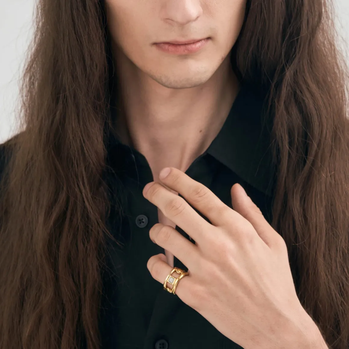 Obrączka została wykonana ręcznie w pracowni ORSKA z pozłacanego mosiądzu, a jej otwarta, organiczna forma ukształtowała się w procesie lania metalu. Pierścionek ma ażurową konstrukcję, która tworzy delikatne linie oplatające palec w płynny, naturalny sposób. Na samym froncie znajduje się fragment meteorytu Aletai, osadzony w kwadratowej, złotej oprawie, co całej kompozycji dodaje niezwykłego charakteru. Kontrast pomiędzy ciepłym odcieniem złota a szarością kosmicznego kamienia tworzy efekt harmonii między ziemskim blaskiem a tajemniczością Wszechświata. Nowoczesny i elegancki pierścionek idealnie zaprezentuje się zarówno na męskim, jak i damskim palcu.