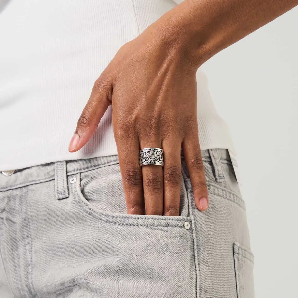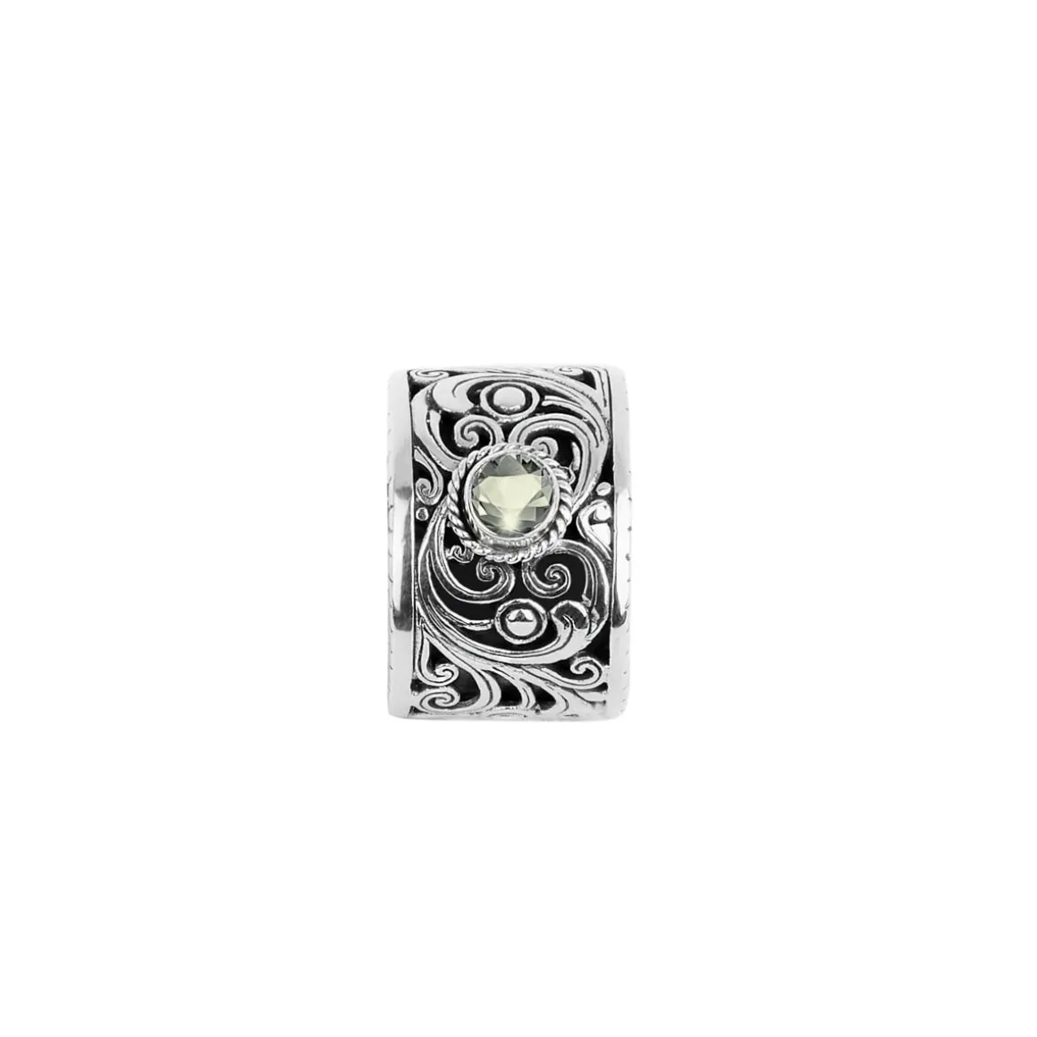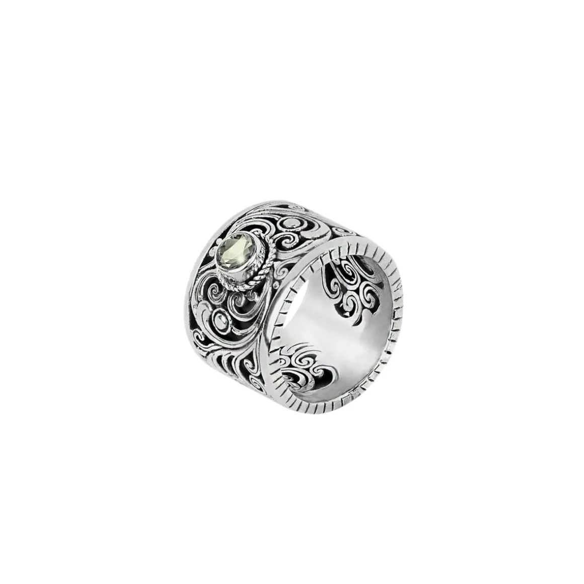Szeroka obrączka została wykonana ręcznie ze srebra próby 925. Pierścionek został bogato ozdobiony floralnym wzorem o lekkiej, ażurowej konstrukcji. Pierścionek zdobi duże oczko. Zielony, fasetowany ametyst oprawiony został w srebrną spiralną koronę. Zielony ametyst jest kamieniem, który tradycyjnie kojarzony jest z energią i odnową. Przypisuje się mu właściwości harmonizujące i stabilizujące. Uważa się, że może wspierać kreatywność, odwagę do podejmowania decyzji oraz pomagać w kształtowaniu nowych, pozytywnych nawyków.