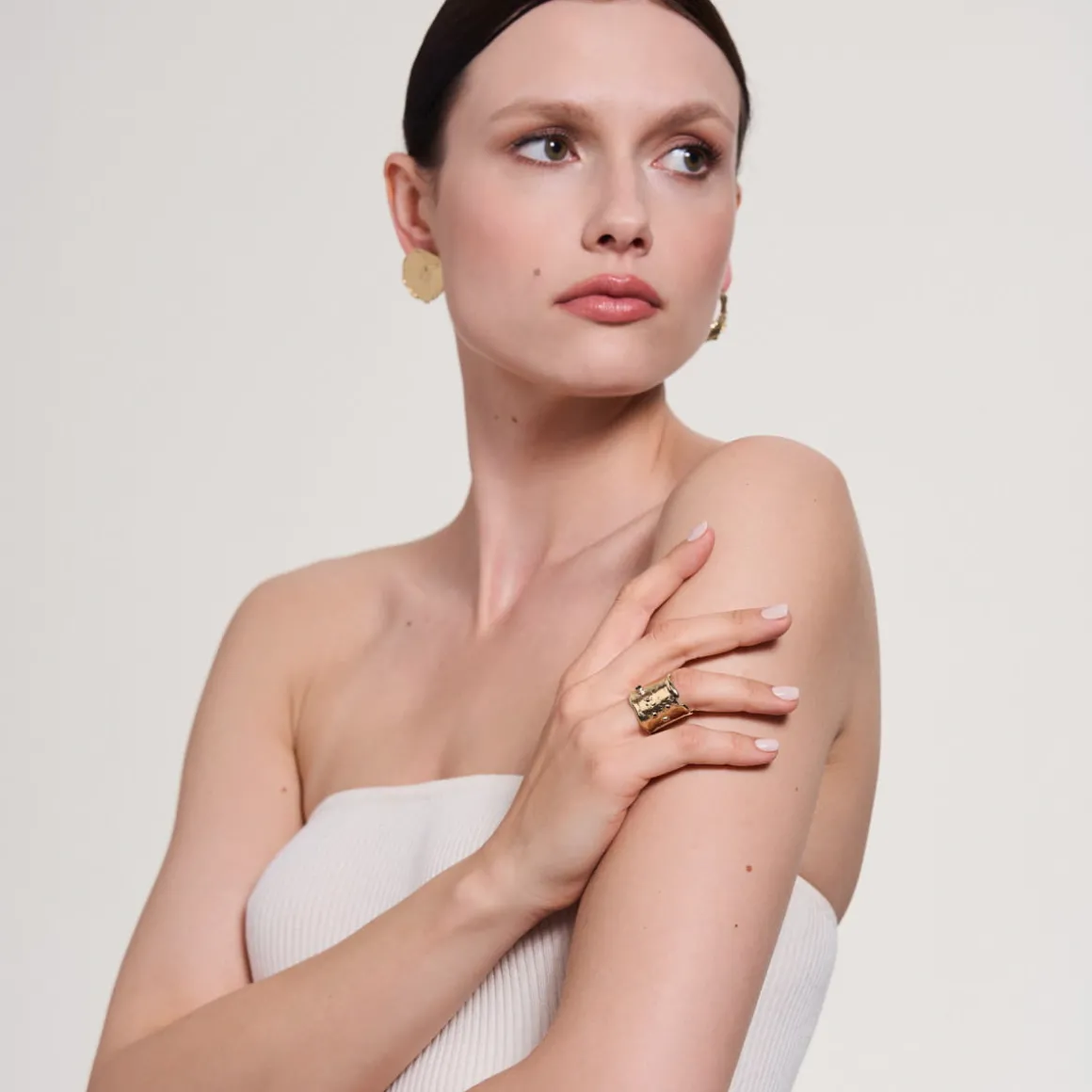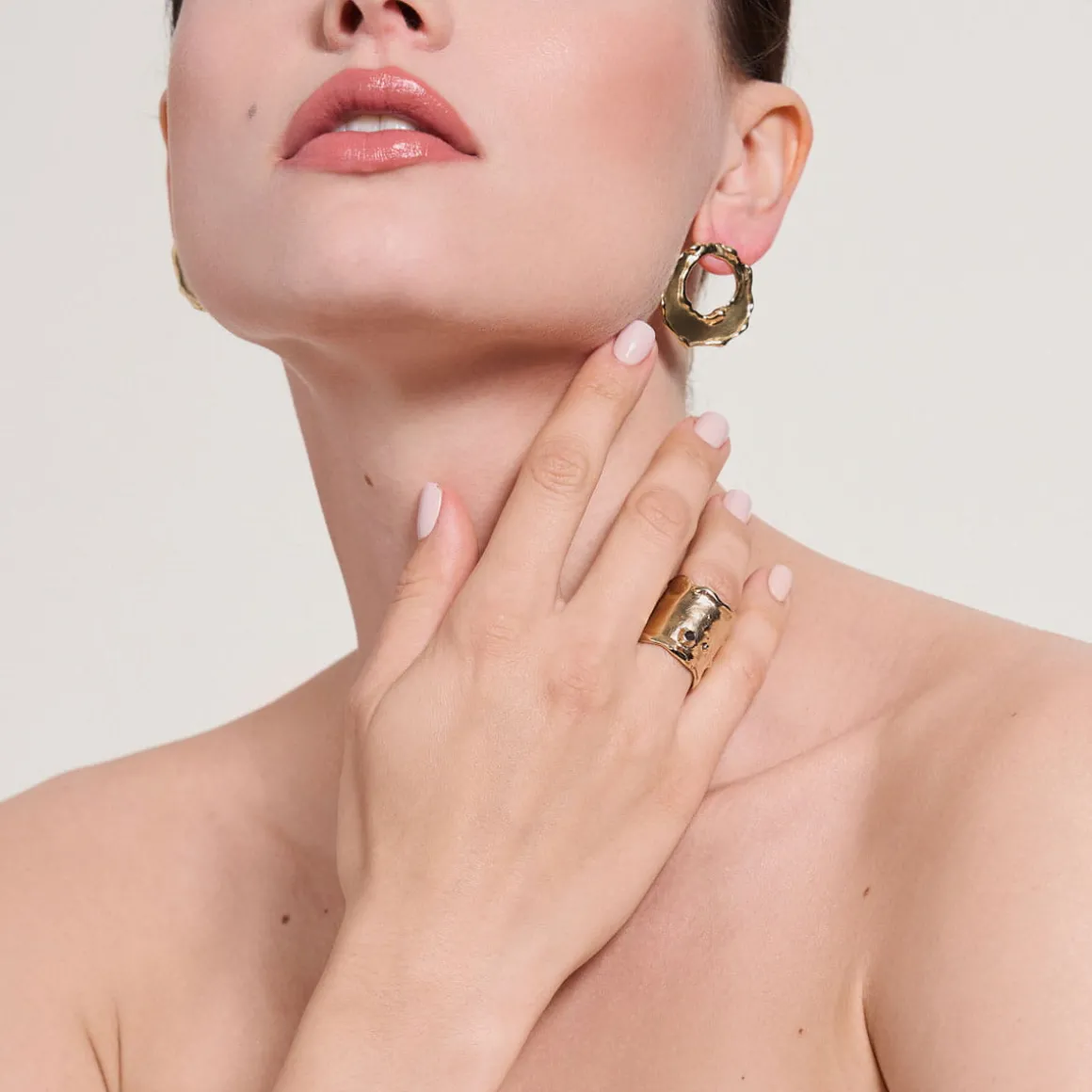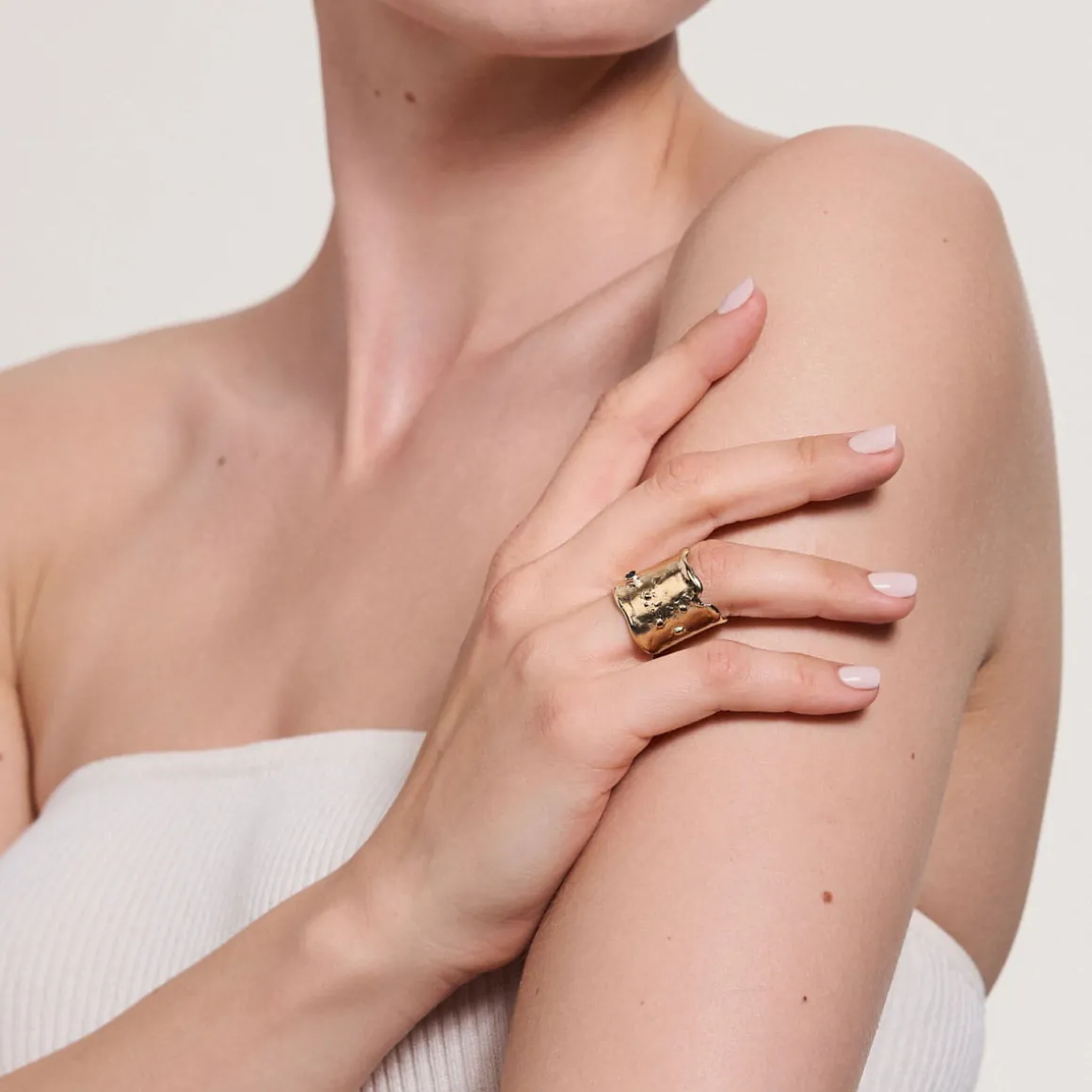 Pierścionek z kolekcji New Stone wyróżnia się nietypowym kształtem. Otwarta obrączka została starannie uformowana z mosiądzu. Brzegi obrączki wykonano w taki sposób, aby sprawiały wrażenie ciekłego, lśniącego metalu spływającego z krawędzi pierścionka. Dzięki procesowi złocenia, obrączka zyskuje swój wyjątkowy kolor, a jednocześnie zwiększa się jej trwałość. Spośród falowanej powierzchni pierścionka wyłania się niewielki kamień. Ciemna bryła z lśniącymi drobinkami została wykonana ręcznie z plastiku przeznaczonego do utylizacji. Ze względu na charakter obróbki tego materiału, kamienie w poszczególnych egzemplarzach mogą nieznacznie różnić się od tych przedstawionych na zdjęciu.