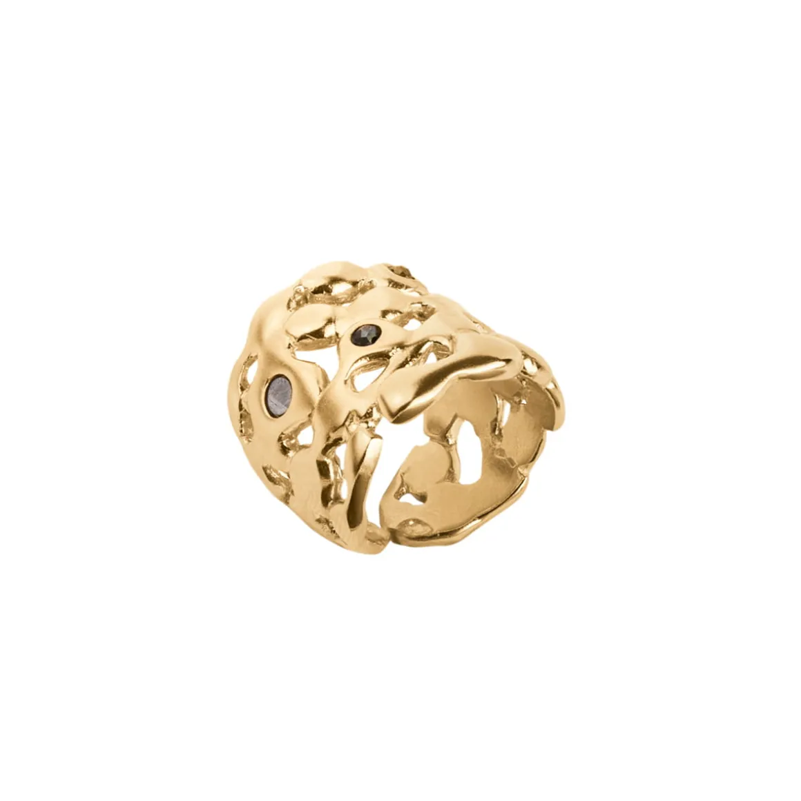 Szeroka obrączka z kolekcji Meteoros zachwyca swoją organiczną formą, która przywodzi na myśl nieregularne powierzchnie ciał niebieskich przemierzających kosmos. Została wykonana ręcznie z pozłacanego mosiądzu. Jej otwarta, ażurowa konstrukcja tworzy efekt falujących i nieregularnych kształtów, które sprawiają wrażenie wyrzeźbionych przez kosmiczne kolizje. Obrączka została ozdobiona meteorytem Aletai, którego srebrno-szara barwa subtelnie kontrastuje z ciepłym złotem oprawy. Pierścionek zdobią także fasetowane piryty, które w towarzystwie kosmicznych cząstek znalazły się nieprzypadkowo. Niektórzy wierzą, że piryty wspierają siłę woli i determinację. Te dwa „kamienie” idealnie się więc uzupełniają. Spadające gwiazdy zachęcają do marzenia, a piryty pomagają zamienić marzenia w rzeczywistość.