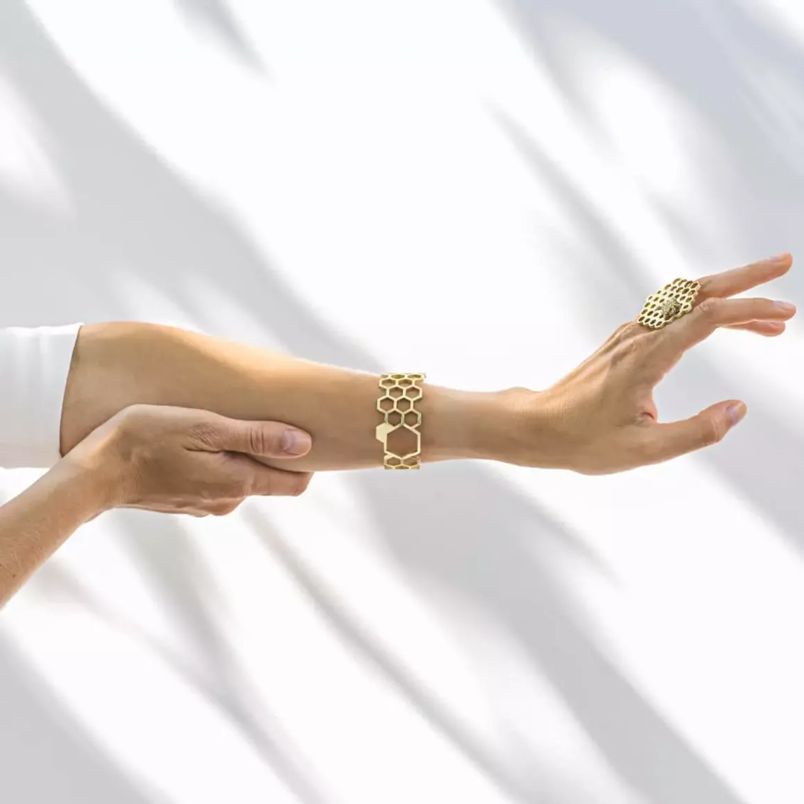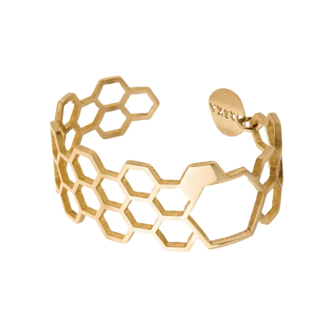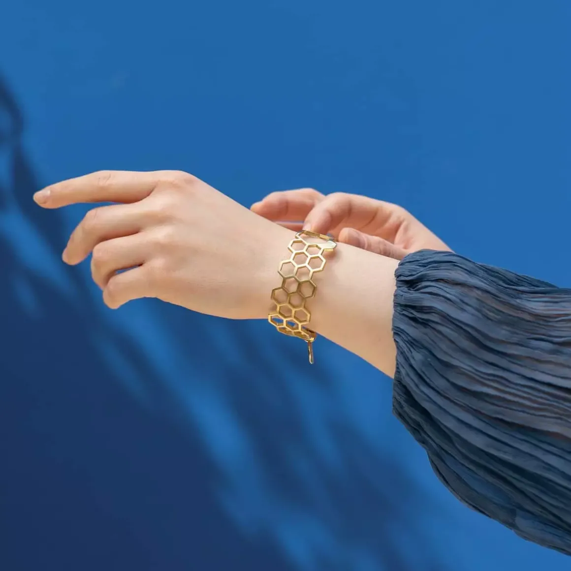 Sztywna, ręcznie wykonana bransoletka z kolekcji Apis została zainspirowana niestrudzoną pracą pszczół i ich perfekcyjnymi dziełami. Te pożyteczne owady stojące na straży naszego ekosystemu to jednocześnie wybitni inżynierowie, których precyzji niełatwo dorównać. ORSKA podjęła wyzwanie, projektując ażurowe elementy inspirowane plastrami miodu. Subtelna bransoletka o heksagonalnym wzorze wyróżnia się płynnie zmieniającą się fakturą bransoletki: przechodzącą od powierzchni satynowej w wysoki połysk i ponownie w satynę. Dzięki minimalistycznemu designowi bransoletka doskonale komponuje się z eleganckimi stylizacjami.