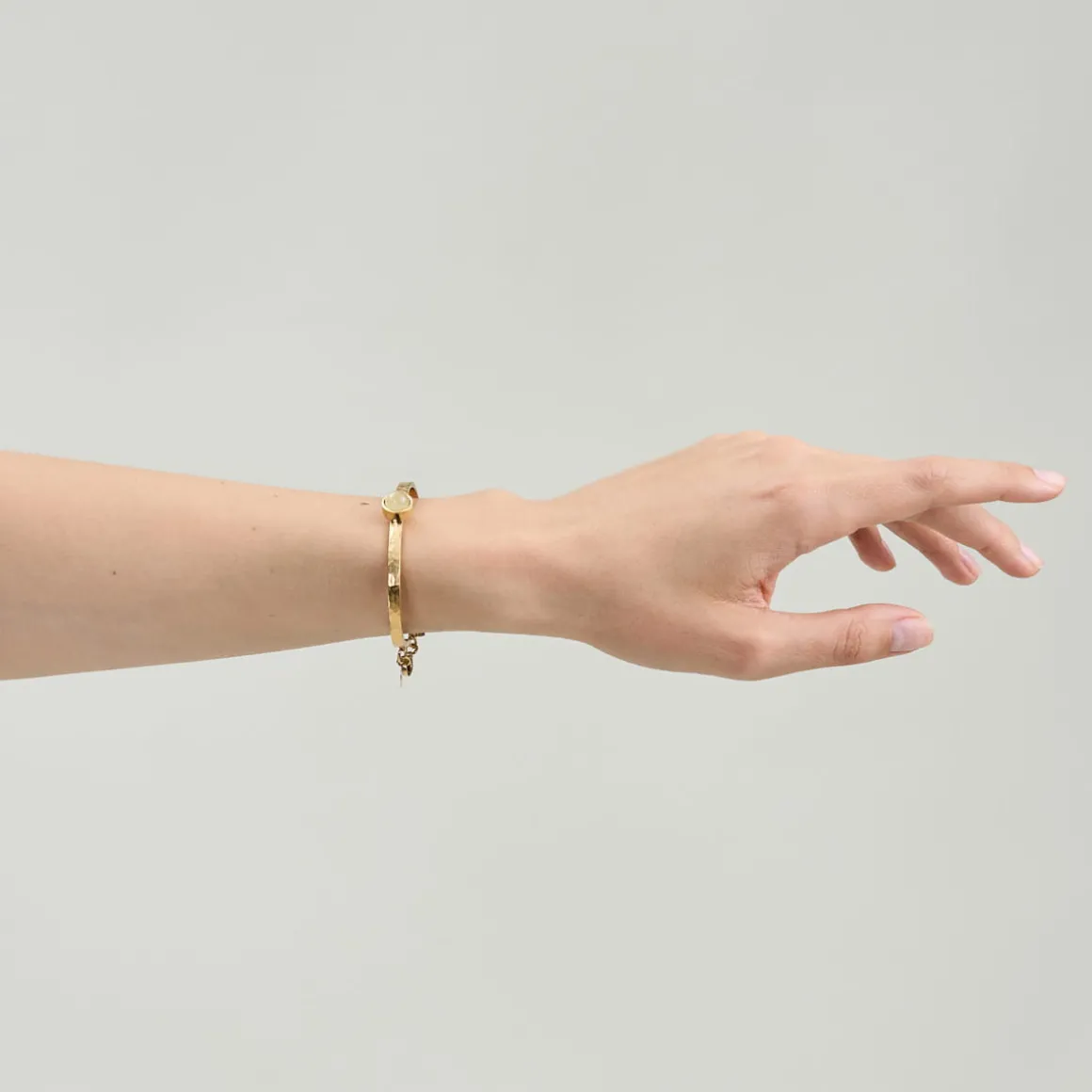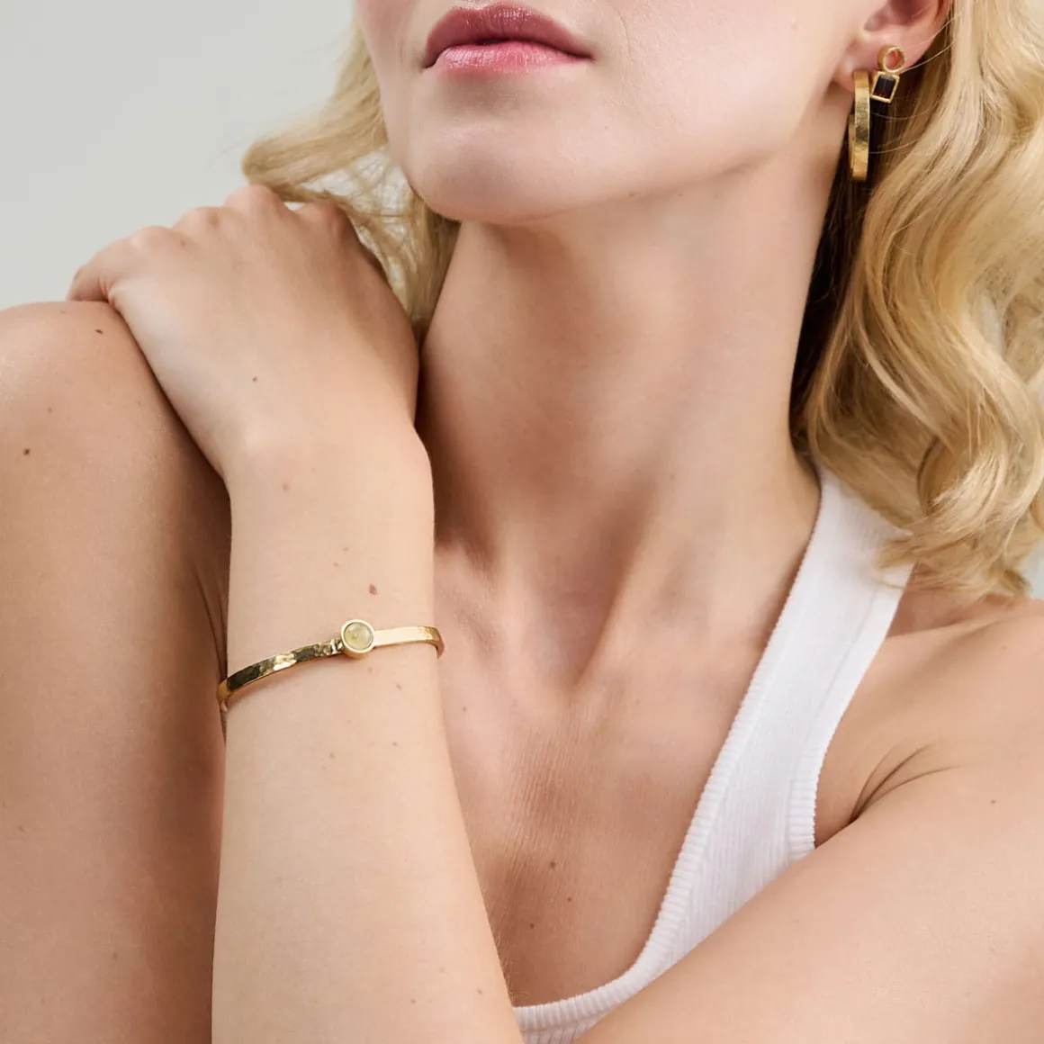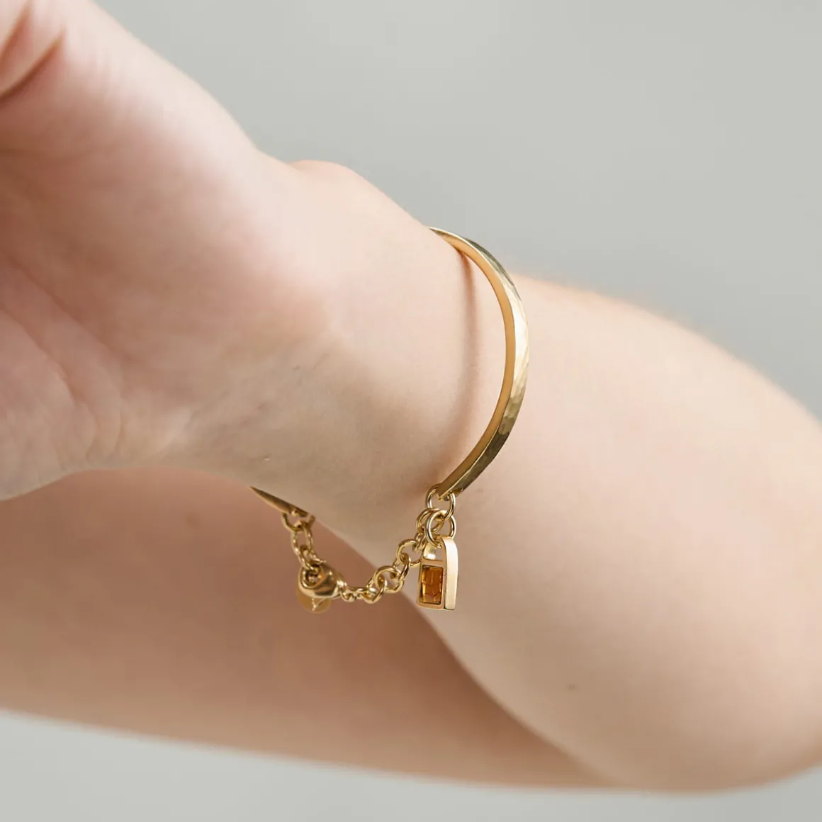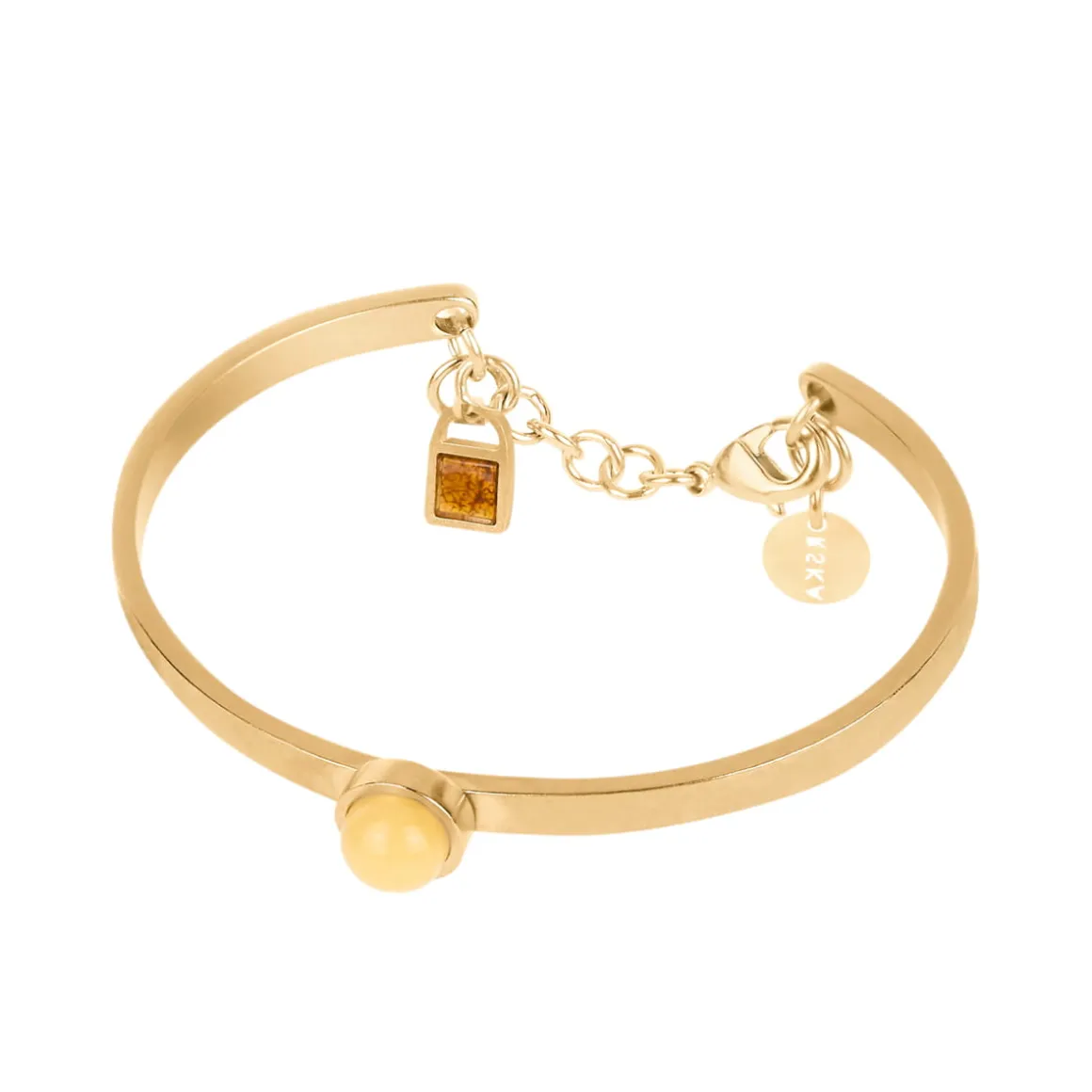 Pozłacana bransoletka z kolekcji Baltica zachwyca minimalistycznym designem. Została wykonana ręcznie z młotkowanego, pozłacanego mosiądzu. Jej centralnym elementem jest kopułowaty bursztyn w pozłacanej oprawie, który zachwyca jasnym kolorem. Na bransoletce znajduje się również zawieszka z kwadratowym, koniakowym bursztynem, która dopełnia całość kompozycji. Bransoletka zapinana jest na karabińczyk z przedłużką z ogniw. Całość zdobi małe logo ORSKA.