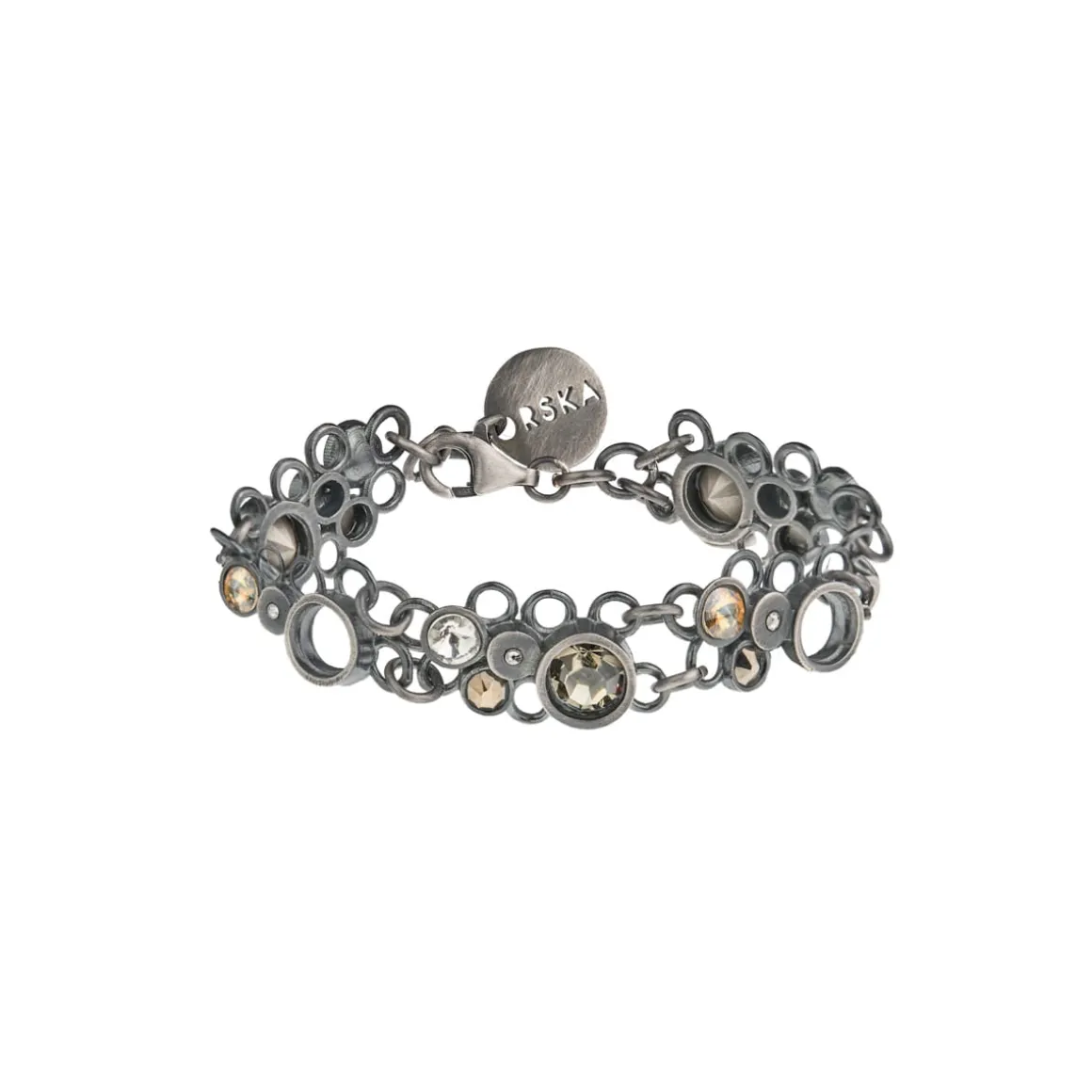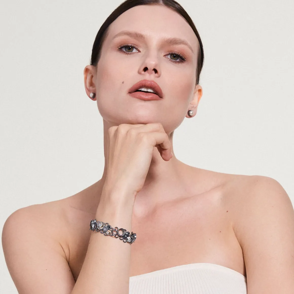 Kolekcja Soda to dyskretny flirt klasyki z nowoczesnością. Tradycyjna elegancja została subtelnie przełamana współczesnymi kryształami, osadzonymi w srebrnych elementach wykonanych w technologii druku 3D. Połyskujące kryształy, wyraźnie kontrastują z grafitową szarością metalu. Artystyczna bransoletka została wykonana ręcznie ze srebra o satynowej powierzchni. Efektowna biżuteria będzie idealną ozdobą dla wielbicieli nieoczywistych rozwiązań, spragnionych unikalnych doznań estetycznych.