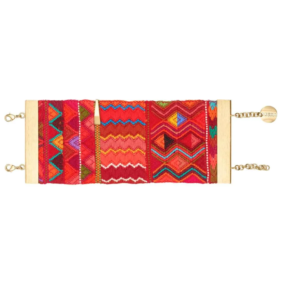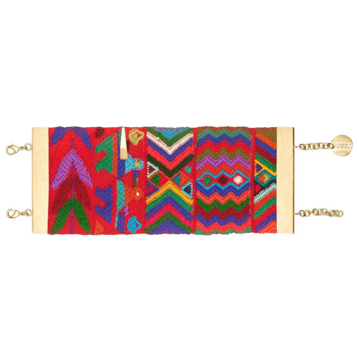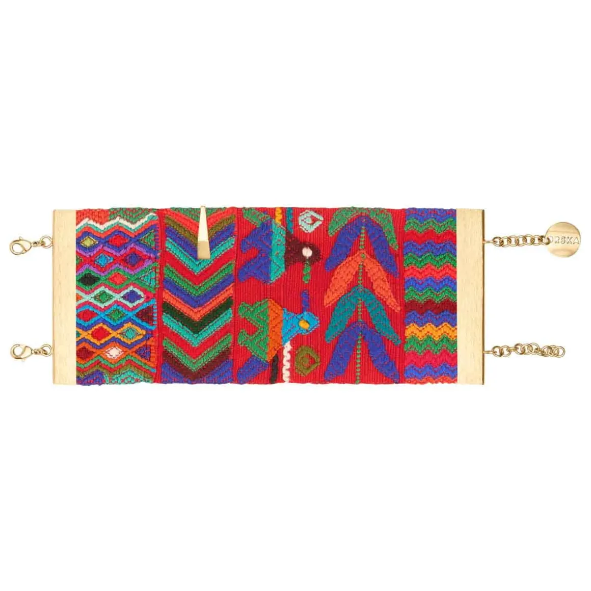 Bransoletka powstała z szerokiego pasma ręcznie tkanej gwatemalskiej tkaniny, która tworzy efektowny materiałowy mankiet na nadgarstku. Wielobarwne wzory, zostały oprawione w pozłacane, mosiężne ramy z charakterystycznym, szczotkowanym wykończeniem – ich drapana faktura kontrastuje z miękkością materiału. Bransoletka zapinana jest na dwa klasyczne karabińczyki z możliwością regulacji długości dzięki przedłużkom, z których jedna ozdobiona jest firmowym logiem. Do tkaniny przymocowano ozdobny mosiężny element w formie ostrosłupa, który nawiązuje kształtem do stożkowych jadeitów z reszty kolekcji, spajając wszystkie elementy tej kolekcji w spójną opowieść.