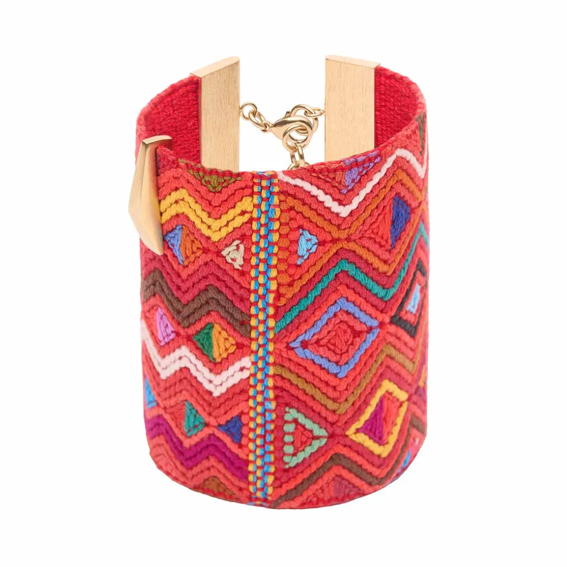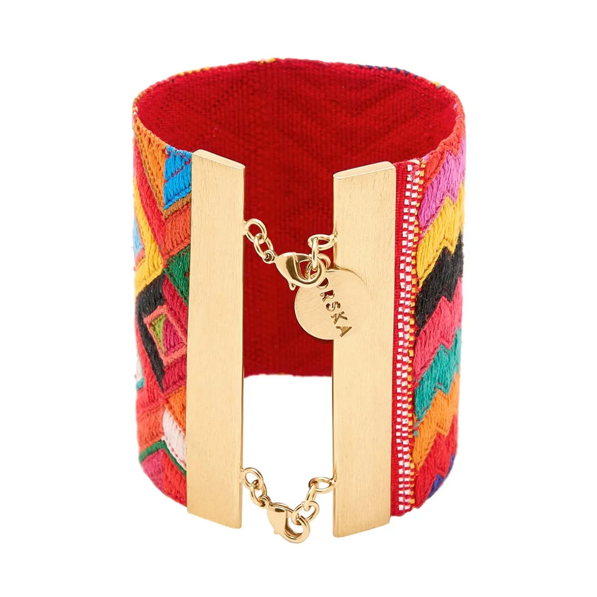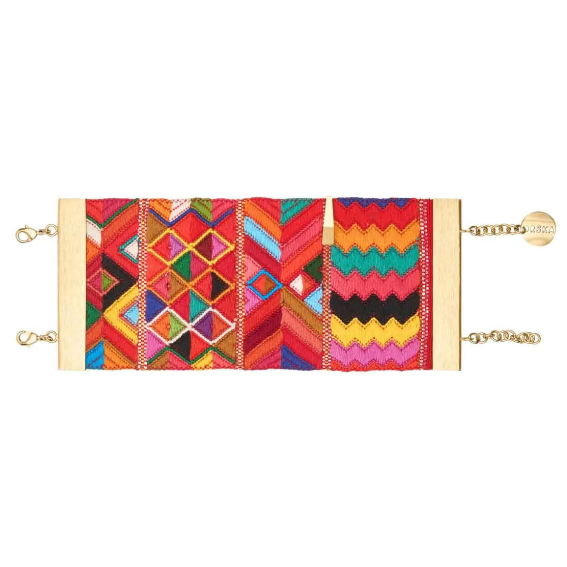 Bransoletka powstała z szerokiego pasma ręcznie tkanej gwatemalskiej tkaniny, która tworzy efektowny materiałowy mankiet na nadgarstku. Wielobarwne wzory, zostały oprawione w pozłacane, mosiężne ramy z charakterystycznym, szczotkowanym wykończeniem – ich drapana faktura kontrastuje z miękkością materiału. Bransoletka zapinana jest na dwa klasyczne karabińczyki z możliwością regulacji długości dzięki przedłużkom, z których jedna ozdobiona jest firmowym logiem. Do tkaniny przymocowano ozdobny mosiężny element w formie ostrosłupa, który nawiązuje kształtem do stożkowych jadeitów z reszty kolekcji, spajając wszystkie elementy tej kolekcji w spójną opowieść.