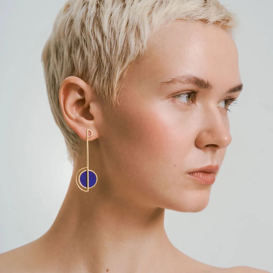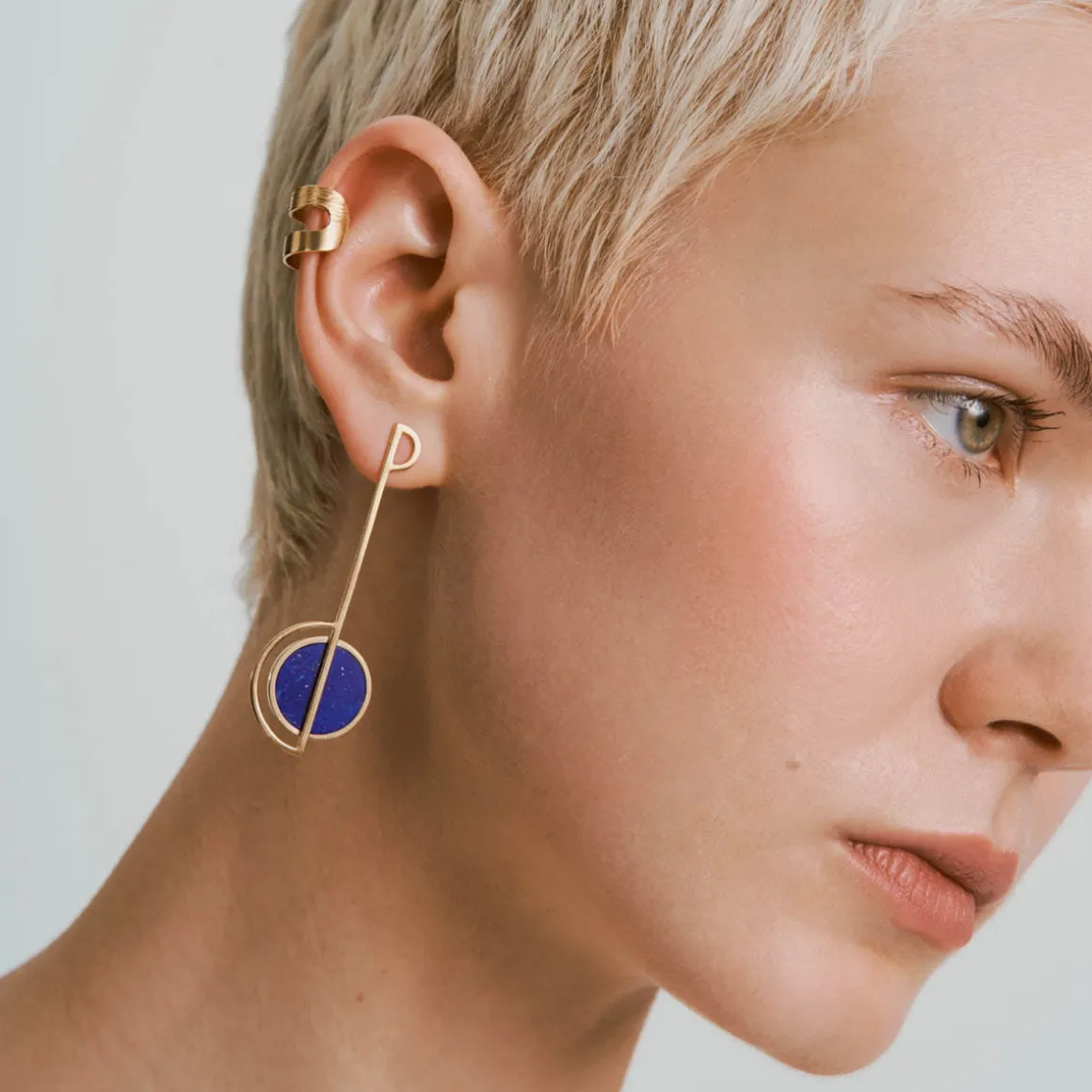 Kolczyki wykonaliśmy z pozłacanego mosiądzu w naszej pracowni jubilerskiej. Smukłą, podłużną formę ozdobiliśmy okrągłym kamieniem lapis lazuli, który nawiązuje do księżycowej pełni. Ta jest symbolem światła i rozkwitu – przypomina, że każdy ma w sobie potencjał by w pełni rozbłysnąć. Lapis lazuli otoczyliśmy delikatną, pozłacaną oprawą. Całość ozdobiona została ażurowym symbolem sierpu Księżyca. Konstrukcja z półokrągłymi i prostymi liniami nadaje kolczykom lekkości, a asymetryczne ułożenie – odważnego charakteru.