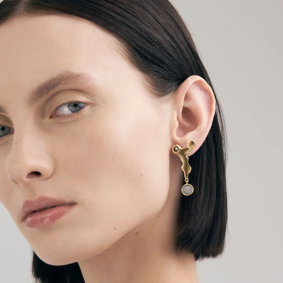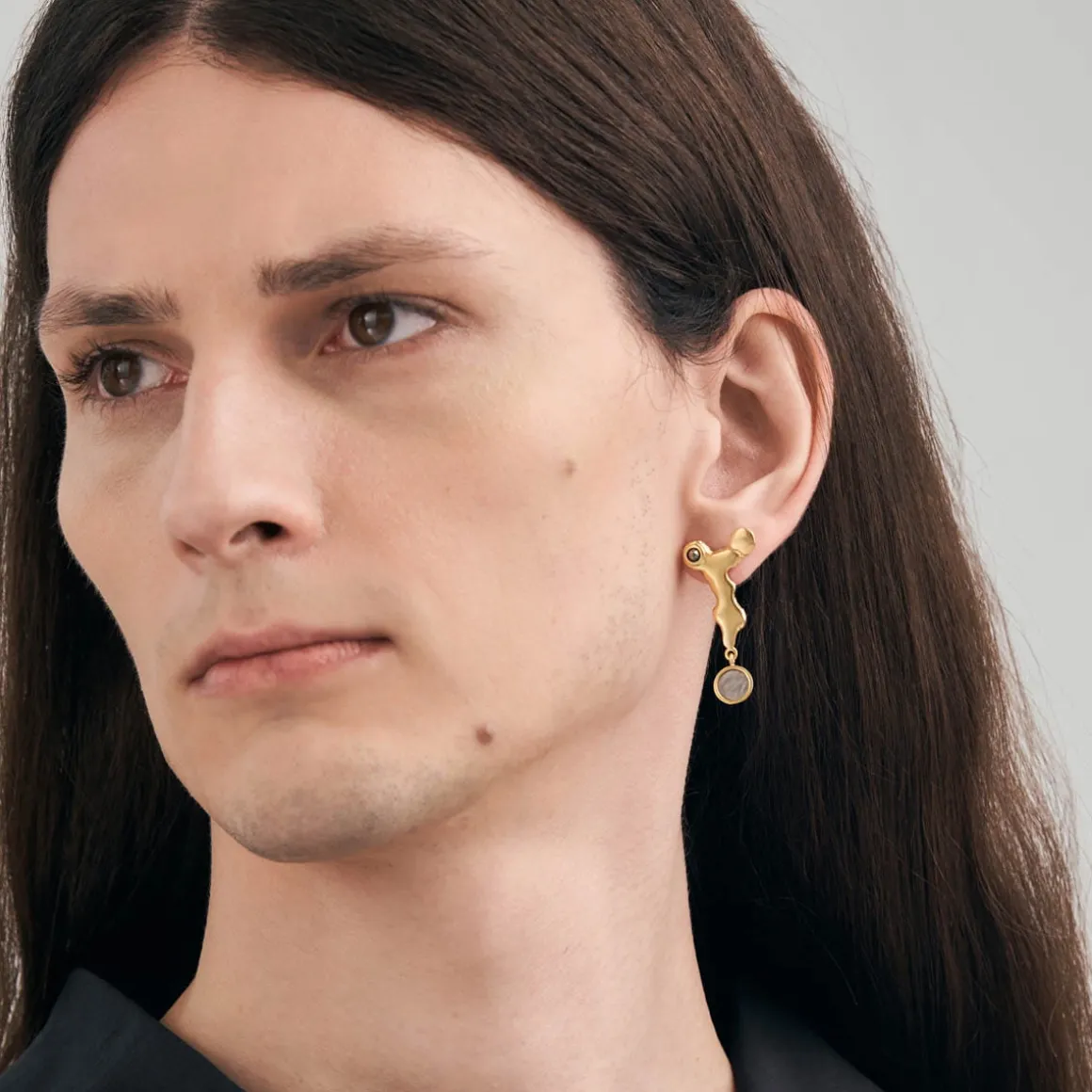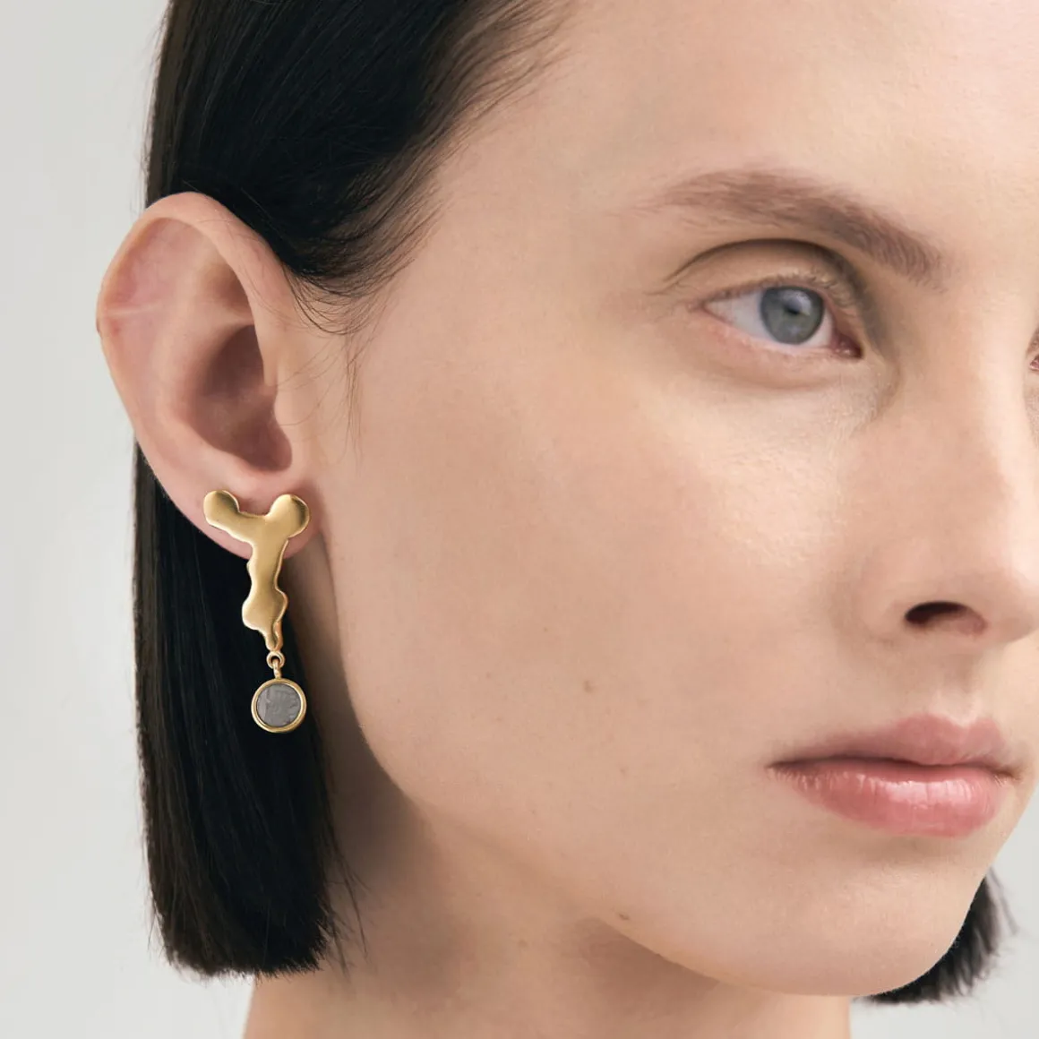 Kolczyki na sztyft z kolekcji Meteoros zostały wykonane ręcznie z pozłacanego mosiądzu. Stworzone w nieprzewidywalnym procesie lania metalu, zyskały miękną, niemal płynną formę, która od razu przyciąga wzrok. Projekt kolczyków został zainspirowany konstelacjami gwiazd, co widać w układzie elementów. Kolczyki mają smukły, rozwidlony na górze kształt. Na dole znajdują się zawieszki z fragmentami meteorytu Aletai. Kamień jest okrągły i ma naturalną, srebrzystą powierzchnię o jodełkowej strukturze. Unikalna barwa meteorytu kontrastuje z ciepłym złotem otaczającej go oprawy. Dodatkowo jeden z kolczyków asymetrycznie zdobi fasetowany piryt o metalicznym połysku. Piryty uznawane są za kamienie wzmacniające siłę woli i determinację, co ułatwia pokonywanie przeszkód i dodaje motywacji. Dzięki temu świetnie wspierają realizację celów, zarówno w życiu osobistym, jak i zawodowym. Idealne połączenie? Spadające gwiazdy pobudzają wyobraźnię i zachęcają do marzeń, a piryty pomagają je zamieniać w rzeczywistość.