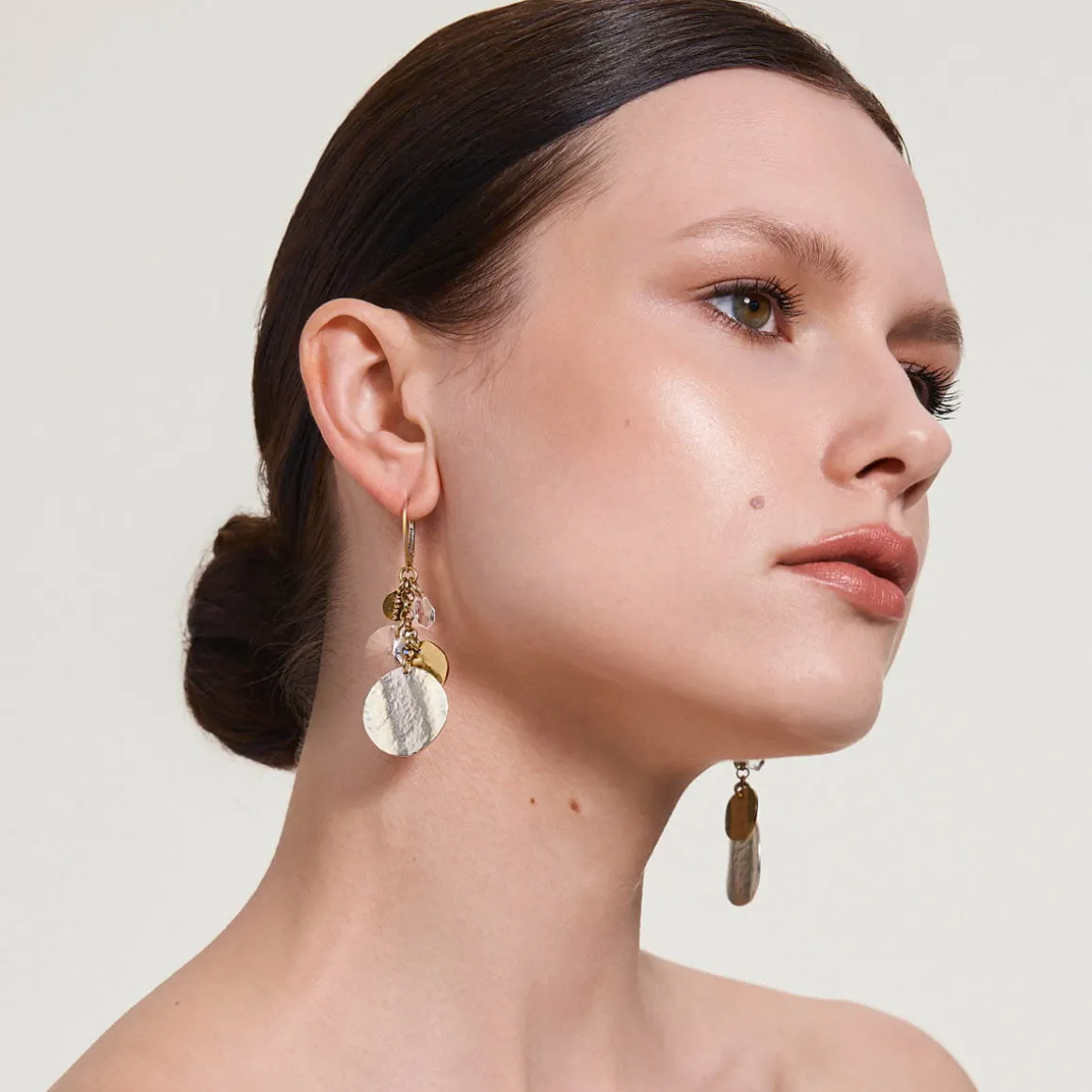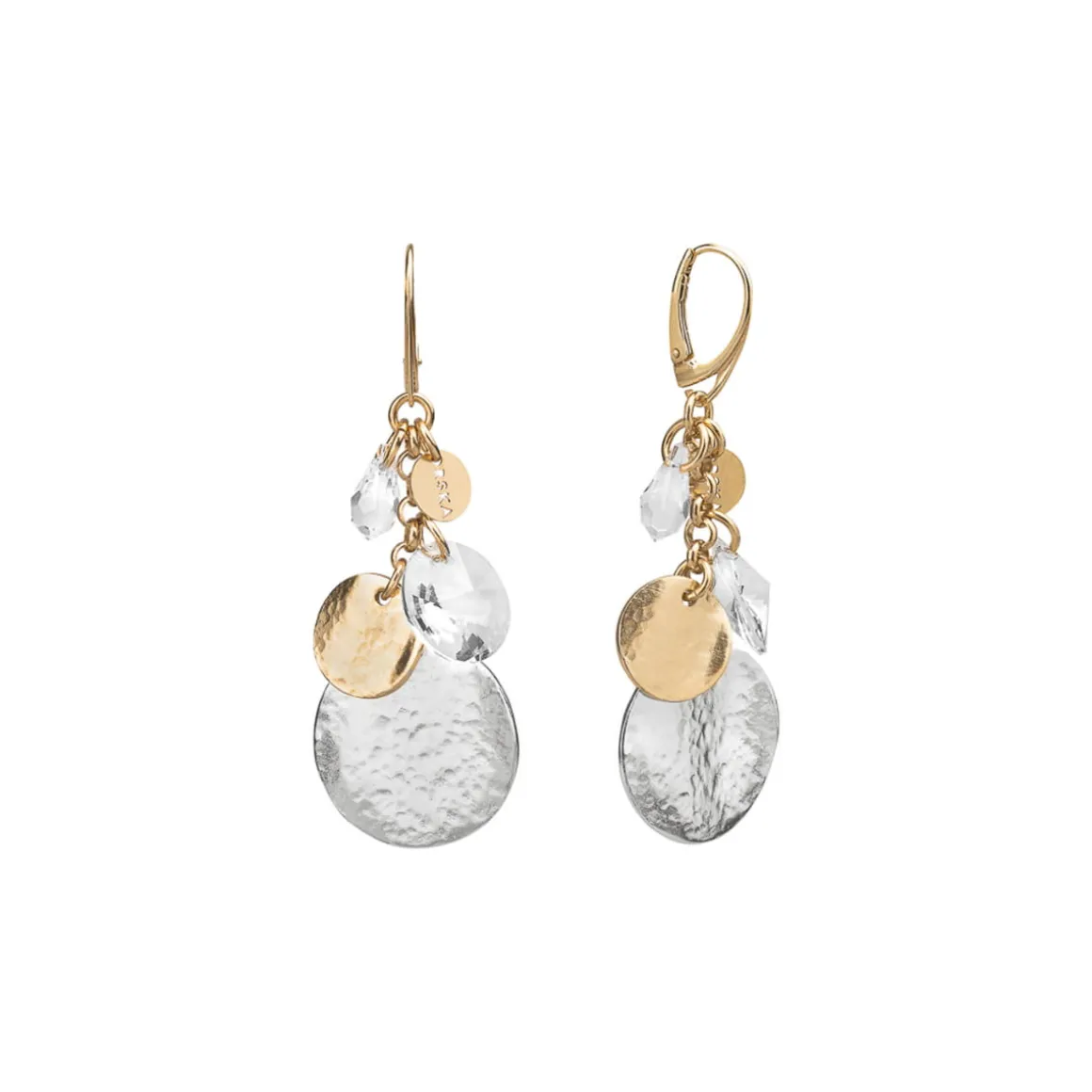 Kolczyki powstały dzięki ręcznej pracy jubilerów w warsztacie ORSKA. Do bogatego grona pozłacanych i srebrnych okręgów podwieszono przezroczyste kryształy, nasuwające skojarzenia z kroplami wody mieniącymi się w słońcu. Całą układankę łączą drobne ogniwa, nadające kompozycji lekkości. Zapięcie typu bigiel angielski nie odkształca się podczas zakładania oraz ściągania, dzięki czemu kolczyki są wygodne w codziennym użytkowaniu. Uniwersalny charakter i elegancka forma sprawiają, że kolczyki będą świetnym uzupełnieniem kreacji zarówno codziennych jak i wieczorowych.
