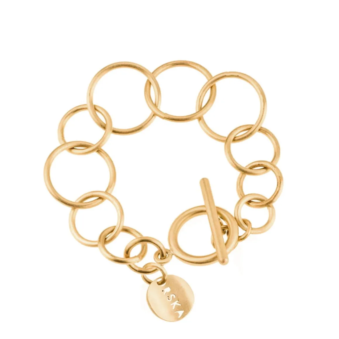 Artystyczna bransoletka z kolekcji Vintage została wykonana ręcznie z pozłacanego mosiądzu. Niewielkie obręcze o satynowej powierzchni zostały połączone w jedną całość zamykaną na ozdobny skobelek. Biżuterię zdobi podwieszone logo ORSKA. Klasyczna, elegancka bransoletka sprawdzi się jako uzupełnienie casualowych stylizacji.