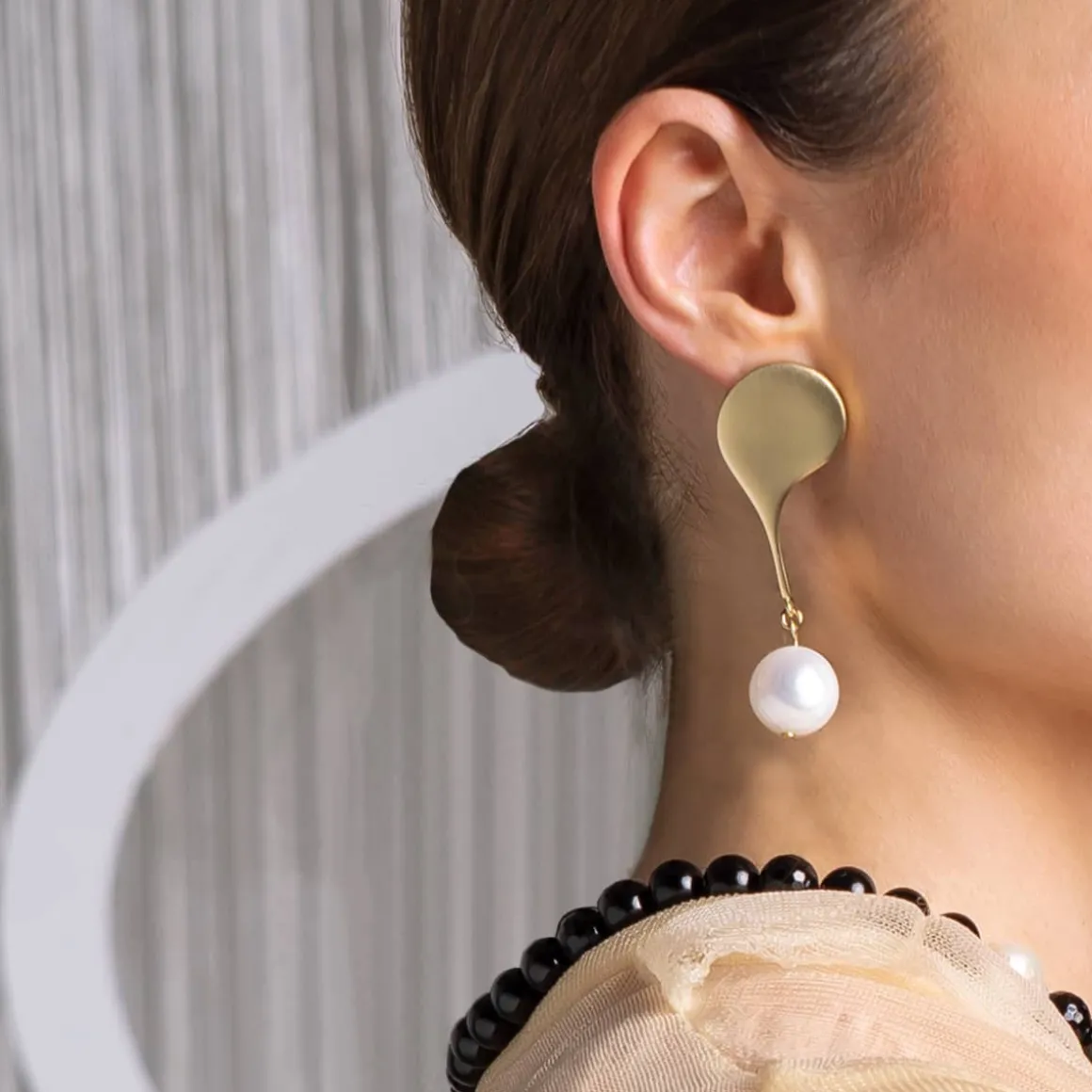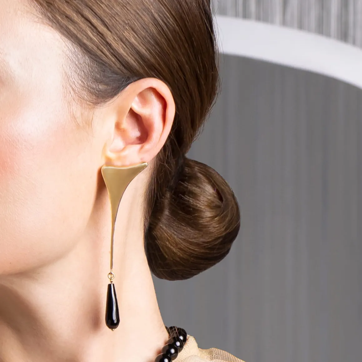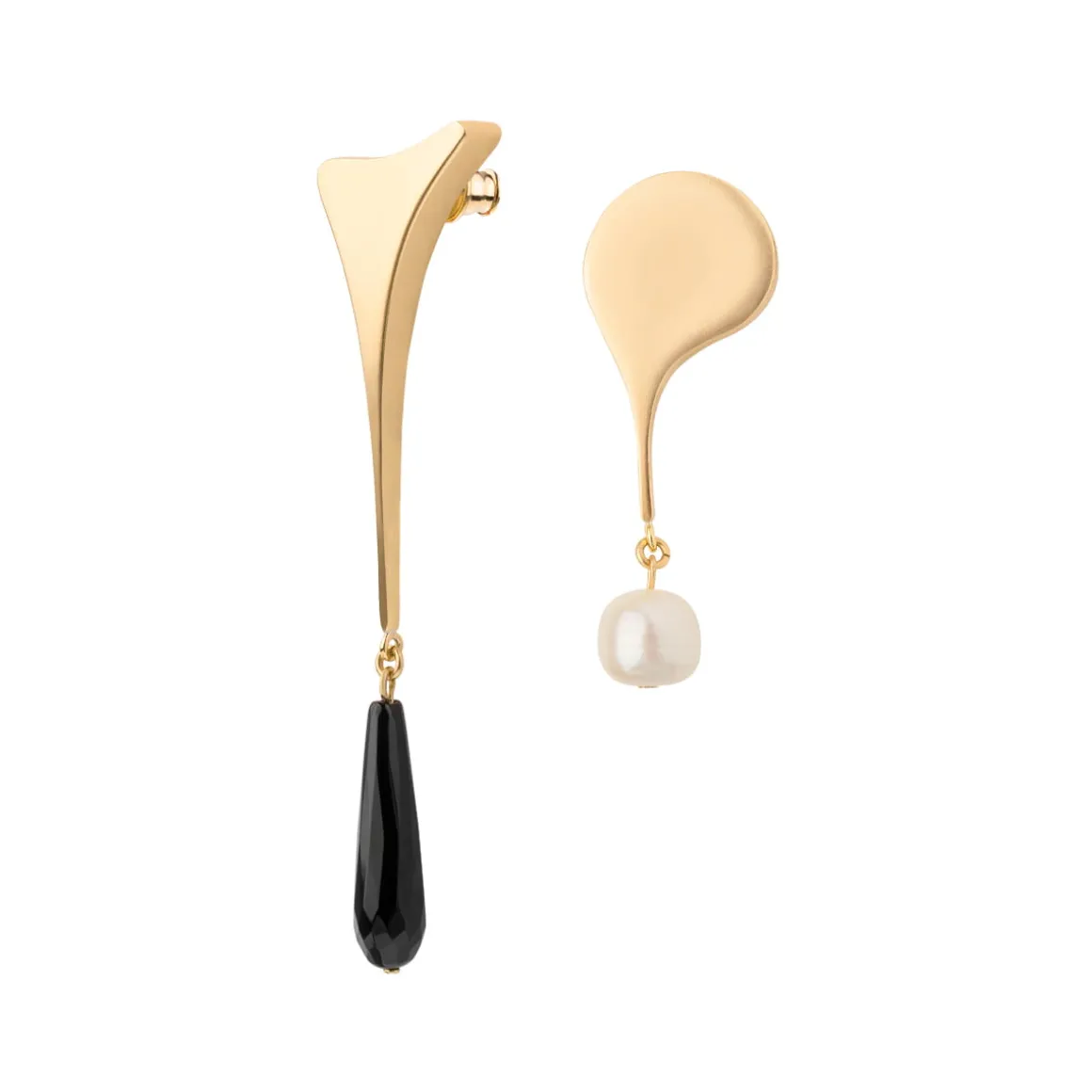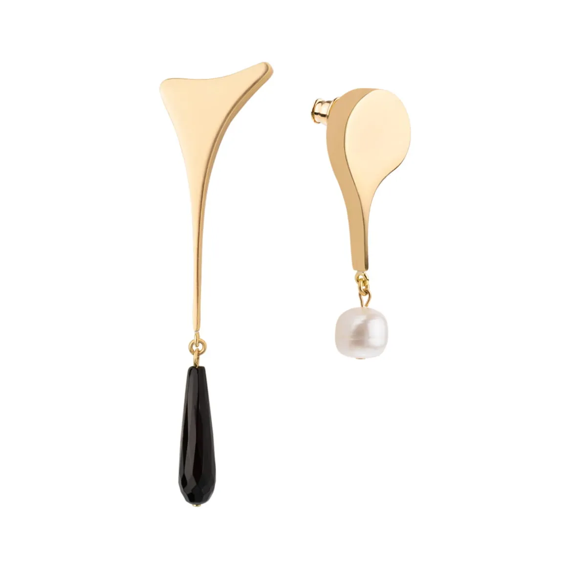 Wiszące kolczyki zostały wykonane ręcznie. Nieregularne, miękkie kształty zostały odlane w mosiądzu, a następnie pokryte złotem. Dłuższy kolczyk zdobiono czarnym onyksem o podłużnym kształcie; do krótszego podwieszono perłę słodkowodną. Kolczyki są asymetryczne, a ich sztyfty wykonano ze srebra. Elegancka biżuteria o minimalistycznym charakterze ozdobi każdą stylizację. Kolczyki dobrze prezentują się w towarzystwie innych wzorów z kolekcji Parer – tworzą zgrany duet z ozdobną broszką z onyksem czy artystycznym sygnetem z masą perłową.