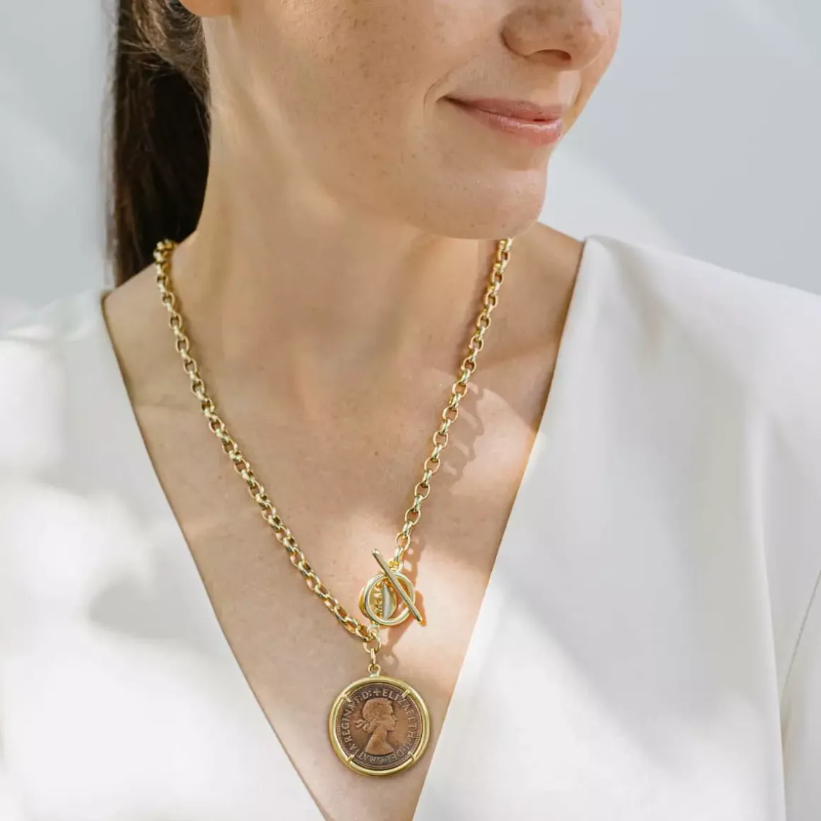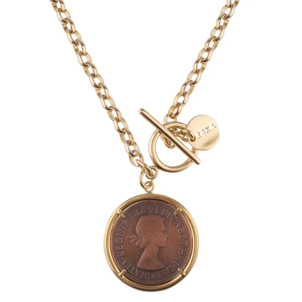 W dobie plastikowych środków płatniczych stare monety odeszły w zapomnienie. Tym pięknym i przynoszącym szczęście warto dać nowe życie i nosić je codziennie na palcu, szyi czy nadgarstku. Anna Orska stworzyła kolekcję DUKATY, której głównymi bohaterami są noszące ślady złotych czasów okrągłe pieniądze. Ręcznie wykonany, długi naszyjnik ozdobiony został monetą w mosiężnej oprawie. Łańcuszek o dużych oczkach zapinany jest na skobelek o dekoracyjnym charakterze.
