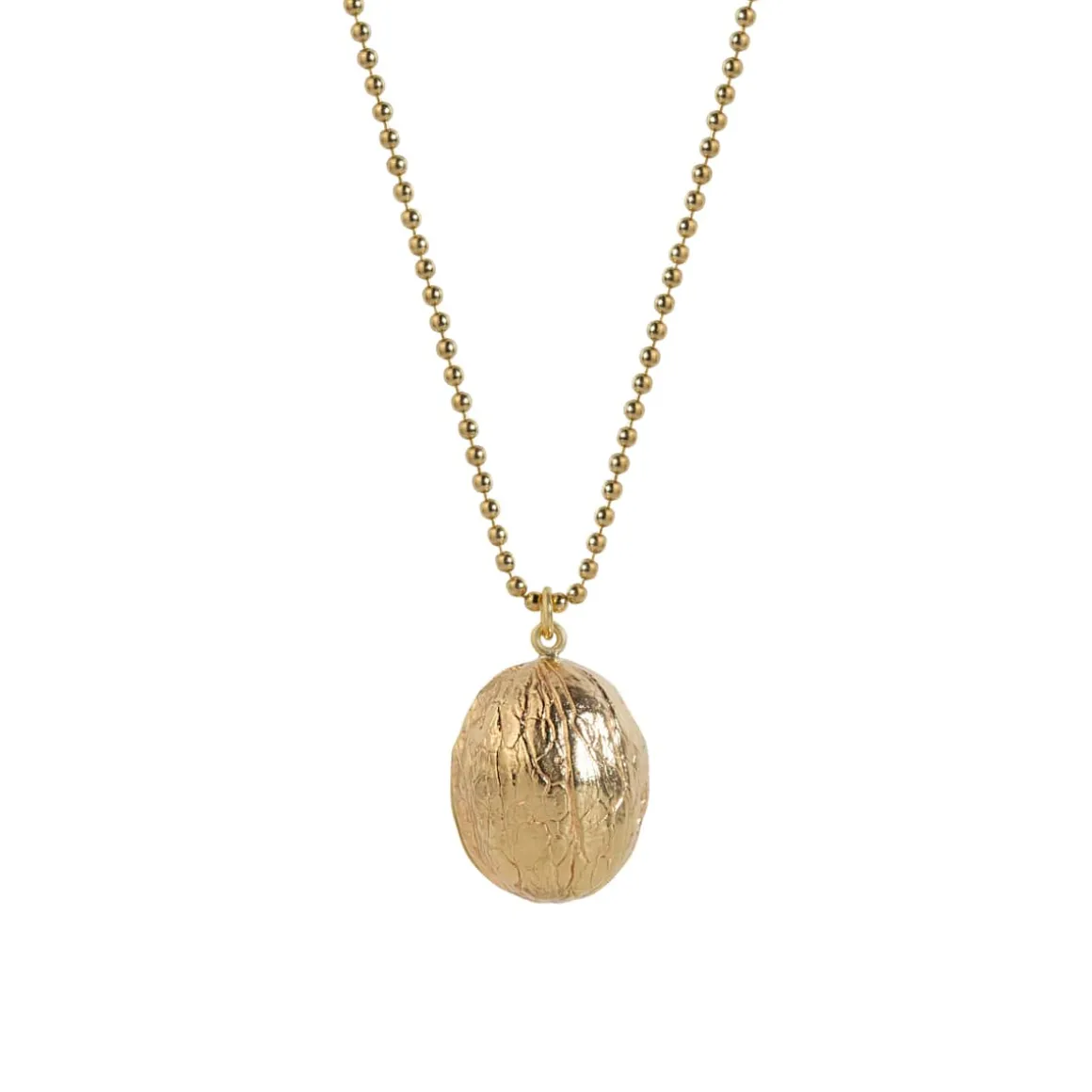 Delikatny naszyjnik został wykonany ręcznie w pracowni ORSKA. Łańcuszek kulkowy ozdobiono zawieszką z logo ORSKA i małą naturalną perłą. Łańcuszek posiada wygodne zapięcie i dwucentymetrową przedłużkę, dzięki której można regulować jego długość. Najbardziej przyciągającym wzrok elementem jest jednak okazały wisiorek w kształcie orzecha włoskiego. Dzięki zastosowaniu technologii odlewu z mosiądzu pozłacanego udało się wiernie odwzorować unikalną strukturę zdobiącą jego skorupę. Podobnie jak prawdziwe orzechy włoskie, wersja ORSKA jest otwierana. Zajrzyj do środka i odkryj ukrytą niespodziankę. Zawieszka składa się z dwóch części zamykanych na magnes. Biżuteryjny orzech włoski skrywa tajemnicę, którą tylko Ty możesz poznać lub wyjawić swoim bliskim. Mosiężny, pozłacany naszyjnik z orzechem włoskim będzie eleganckim prezentem dla przyjaciół lub członków rodziny; zarówno mężczyzn, jak i kobiet. Będzie pasował do codziennych stylizacji, dodając im złocistego blasku.