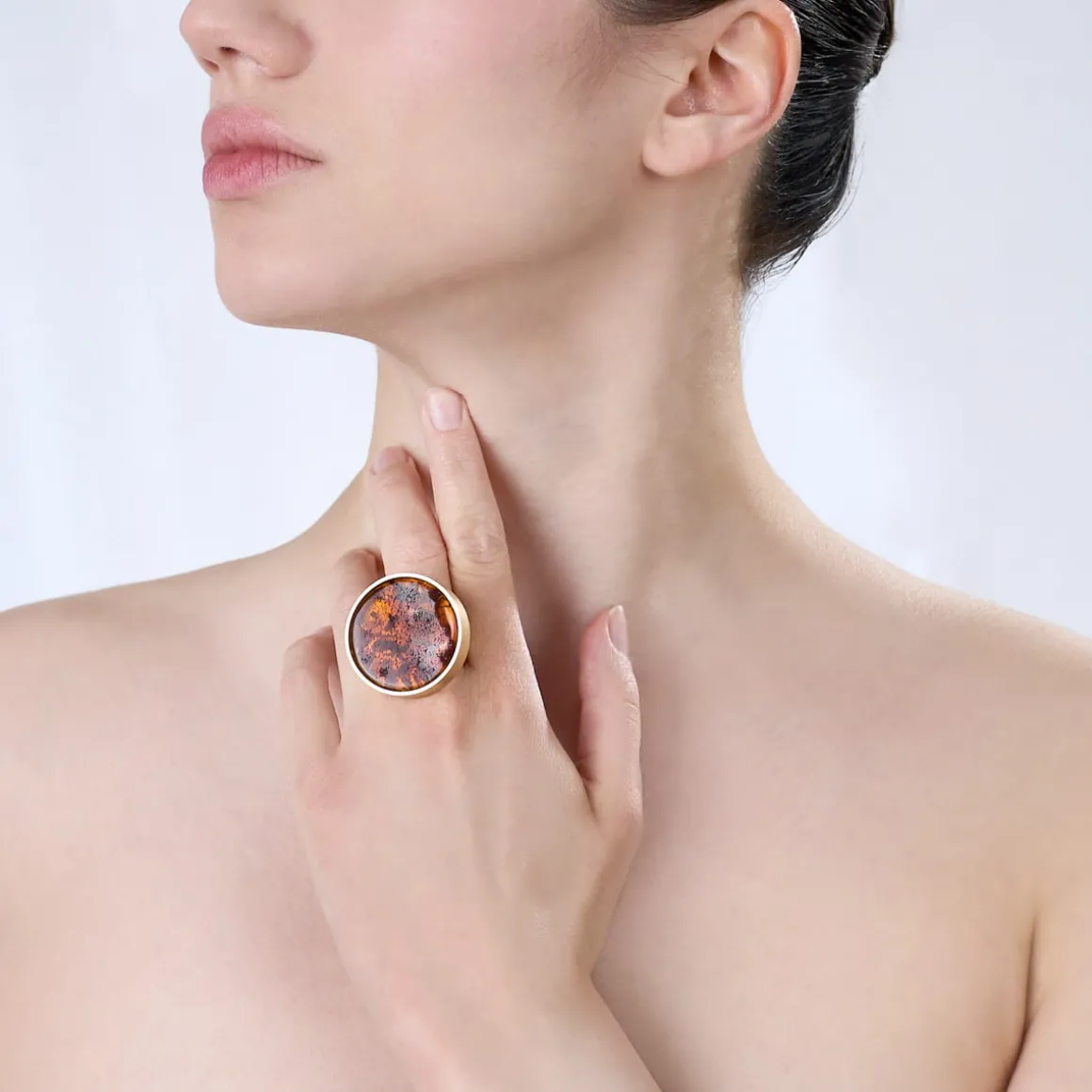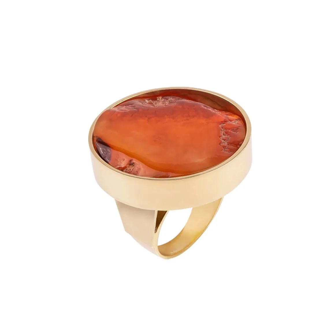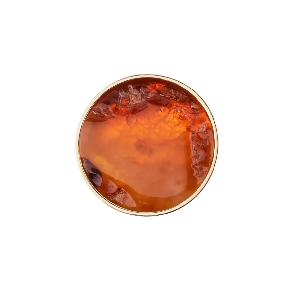Sercem pierścionka jest duży, naturalny bursztyn w koniakowym kolorze, który w pracowni ORSKA zyskał pozłacaną oprawę z mosiądzu. Prosta, geometryczna forma podkreśla unikatowość i naturalne piękno surowca. Bursztynowy pierścionek jest w 100% wykonany ręcznie. Na naszej stronie internetowej w zakładce rozmiary znajdują się wskazówki jak odpowiednio dobrać rozmiar pierścionka.