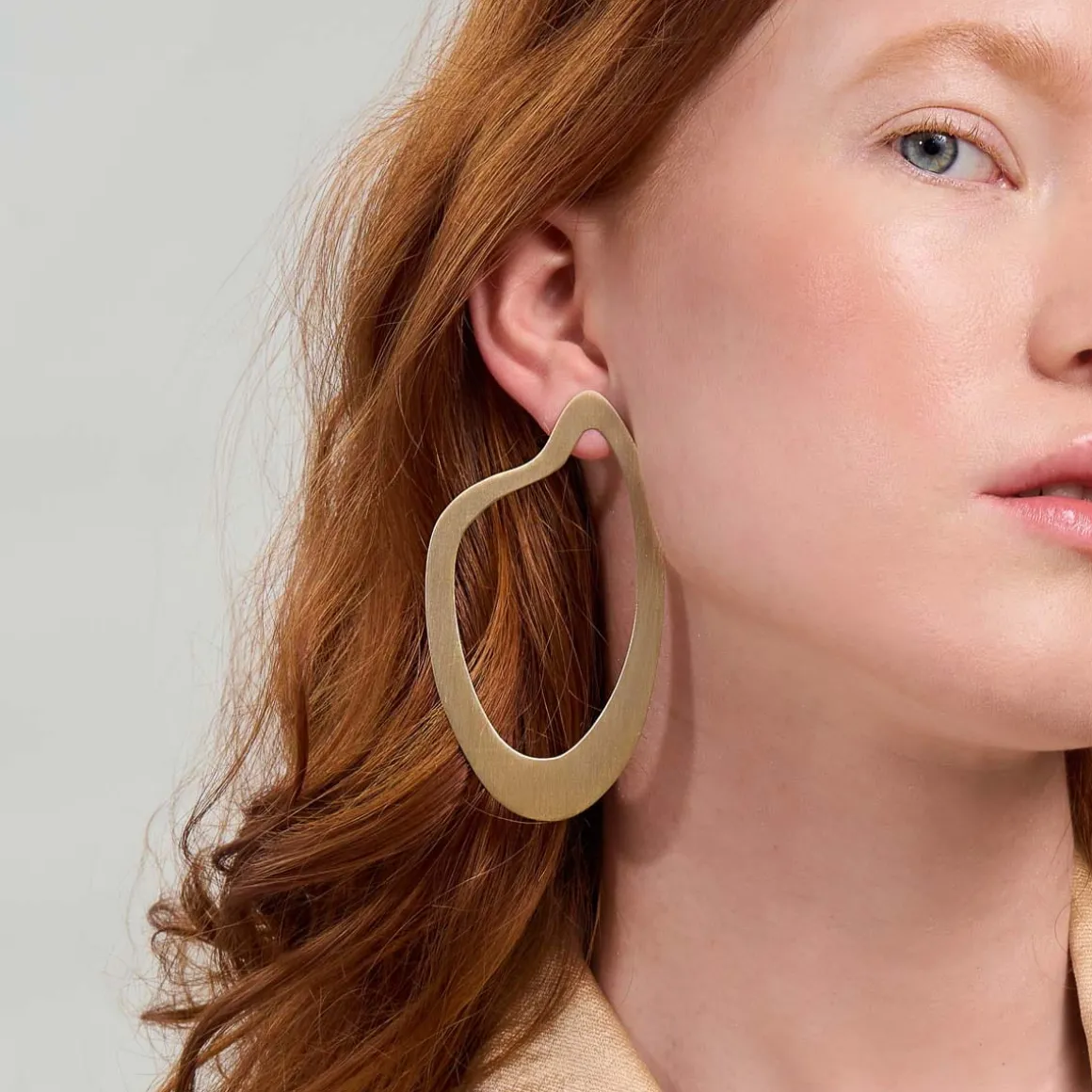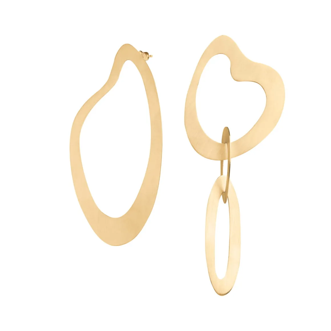 Wiszące kolczyki powstały dzięki ręcznej pracy jubilerów w warsztacie ORSKA. Komplet składa się z dwóch asymetrycznych kolczyków o satynowym wykończeniu. Pierwszy z nich ma formę nieregularnej, płaskiej obręczy w miękkim, finezyjnym kształcie inspirowanym sztuką abstrakcyjną. Drugi kolczyk składa się z trzech połączonych obręczy z pozłacanego mosiądzu. Całość jest lekka i wygodna. Dzięki uniwersalnemu charakterowi i eleganckiej formie kolczyki będą świetnym uzupełnieniem zarówno codziennych, jak i wieczorowych kreacji.