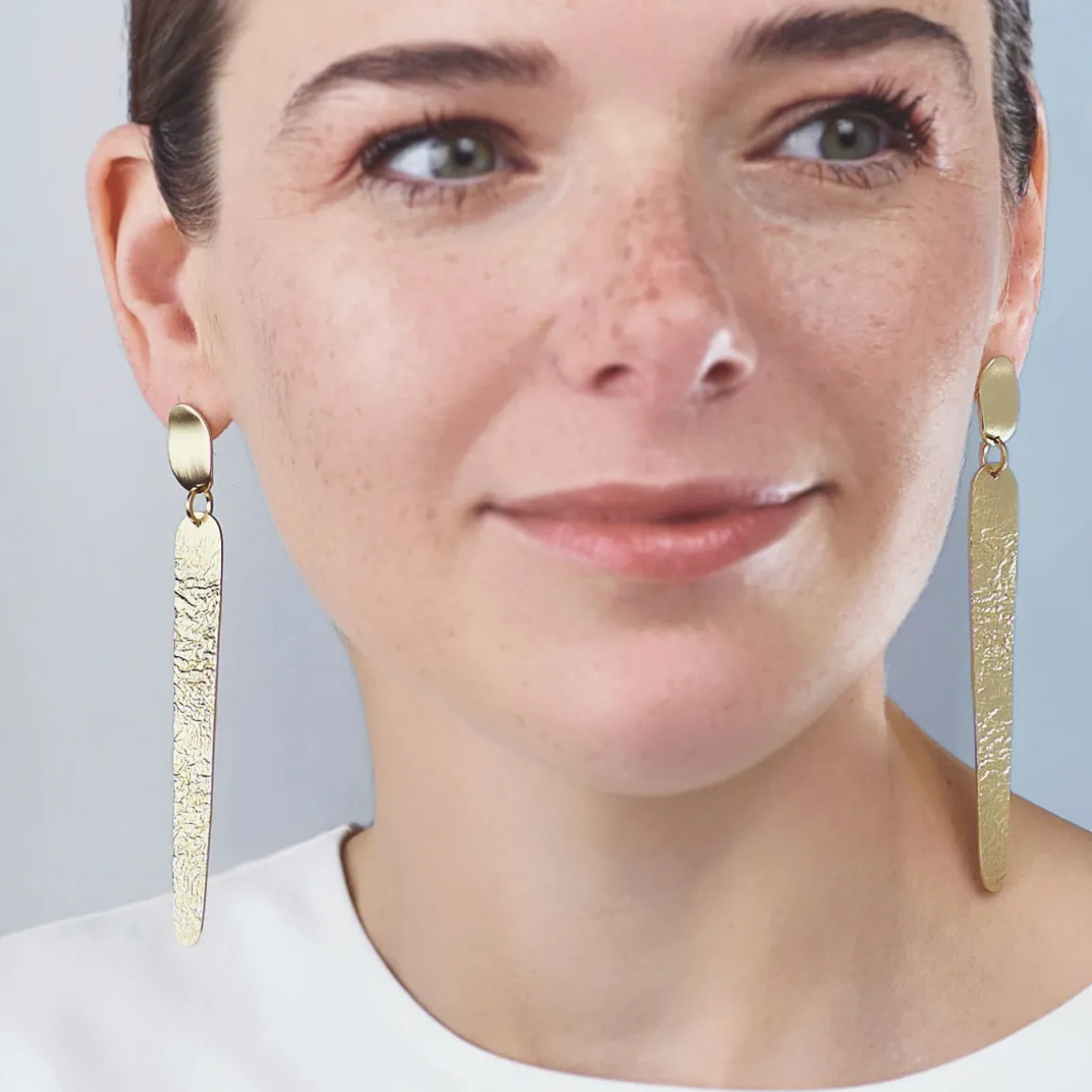 Artystyczne kolczyki na sztyfcie z kolekcji Moon zostały ręcznie wykonane z pozłacanego mosiądzu. Podłużne płaszczyzny, pod wpływem wysokiej temperatury, przyjęły niepowtarzalną strukturę zagięć, która przywodzi na myśl krajobraz księżycowy. Dłuższy element podwieszono do krótszego, o kutej powierzchni, która dodaje całości nowoczesnego sznytu. Wiszące kolczyki posiadają satynowe wykończenie. Oryginalny design najlepiej prezentuje się w towarzystwie innych wzorów z tej samej kolekcji. Pozostaje więc tylko wybrać wielkość konstelacji, aby stworzyć własny Układ Słoneczny.