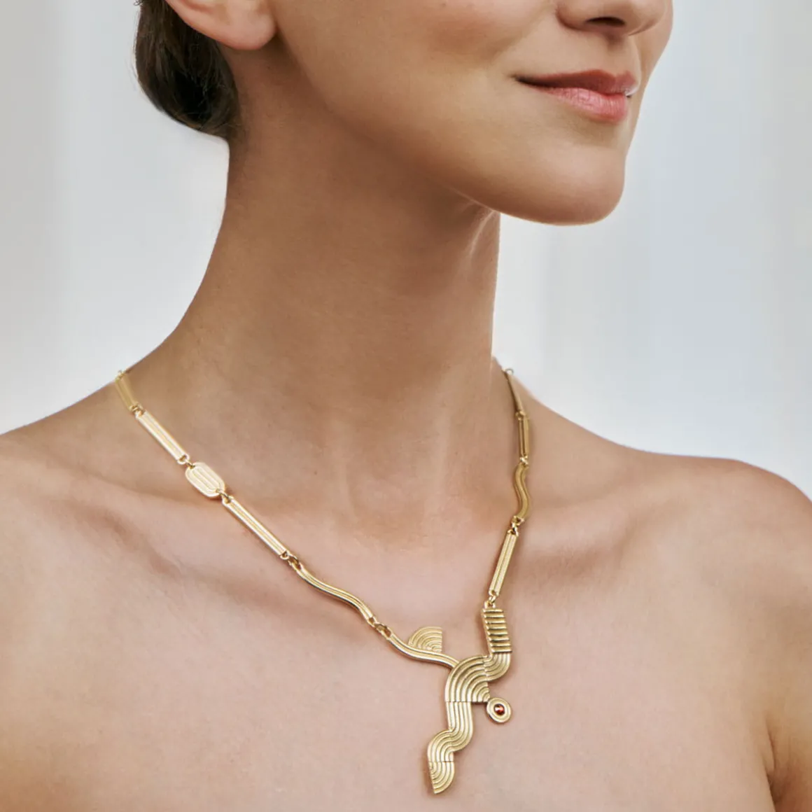 Artystyczny naszyjnik z kryształem został wykonany ręcznie w poznańskiej pracowni. Geometryczne elementy z pozłacanego mosiądzu tworzą oryginalny łańcuch z zapięciem na karabińczyk oraz logo ORSKA. Fantazyjne formy i linearne zdobienie zawieszki oddają symbolikę żywiołów. Alegoria powietrza ma kształt nieustannie pędzącego łuku. Minimalistyczny symbol ziemi to nawiązanie do widoku pól z lotu ptaka. Znak wody zainspirowany został miękką falą morskich pływów. Energię ognia oddaje kryształ w kolorze ciepłej czerwieni. Biżuteria z kolekcji Holos, przedstawiając symboliczną współpracę żywiołów, zachęca byśmy docenili uzupełniającą się istotę natury. Choć naszyjnik doskonale prezentuje się solo, lubi też towarzystwo pozostałych wzorów z kolekcji Holos – asymetryczne kolczyki z czerwonym kryształem lub podwójny, pozłacany pierścionek utworzą wraz z nim duet, obok którego nie da się przejść obojętnie.