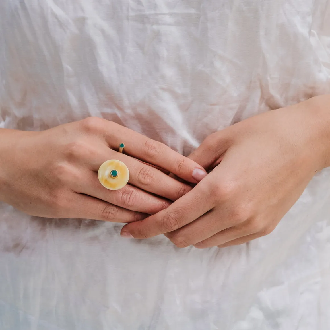 Pierścionek z bursztynem został wykonany ręcznie. Otwartą obrączkę o satynowym wykończeniu zdobi miodowy bursztyn, a na jej końcach umieściła zielone oczka z syntetycznego kamienia Mare. Naturalny kamień został oszlifowany w rodzinnej pracowni na Mierzei Wiślanej. Elegancki pierścionek lubi towarzystwo pozostałych wzorów z kolekcji Baltica – szeroka bransoletka czy wiszące kolczyki z bursztynem wraz z nim utworzą duet, który uzupełni każdą stylizację.