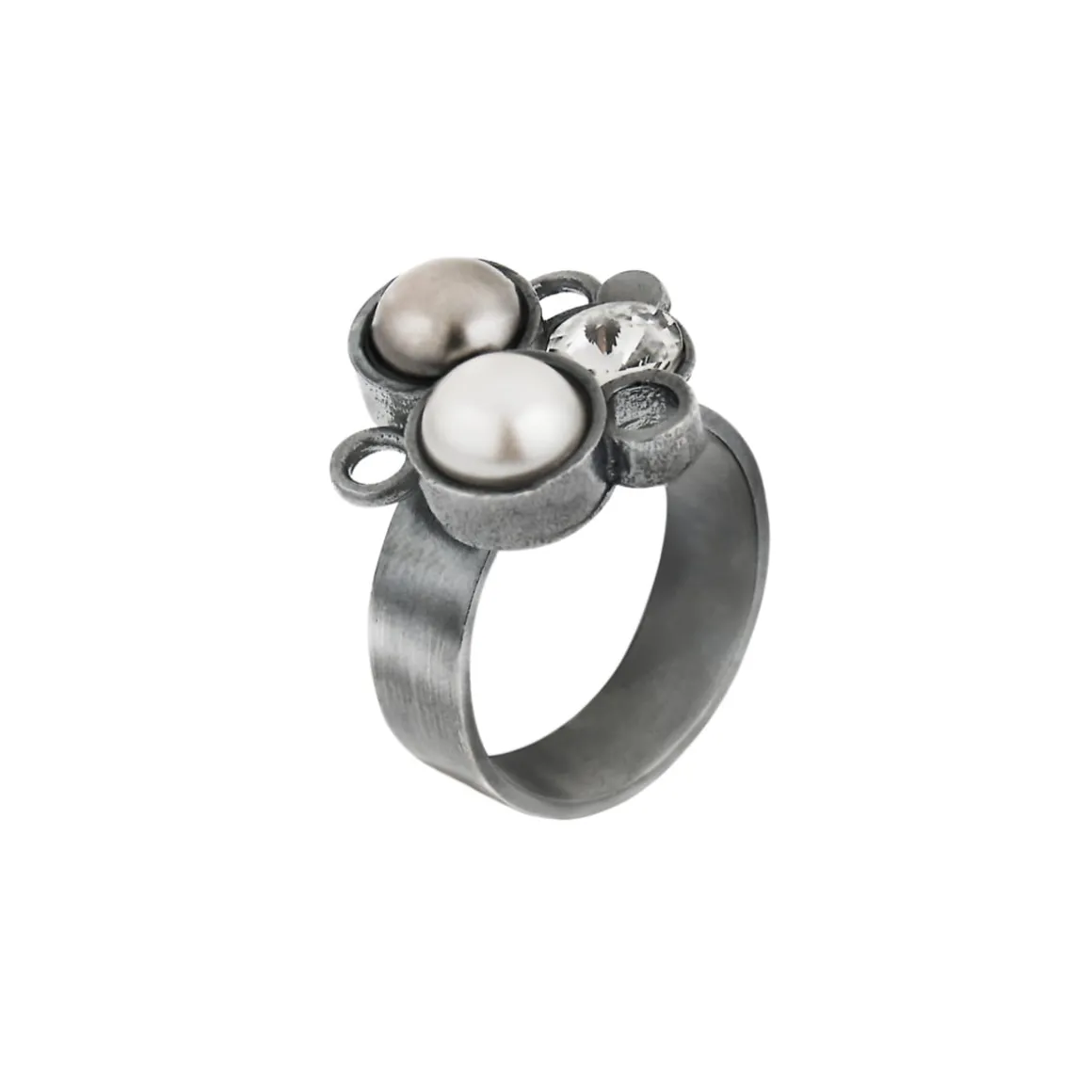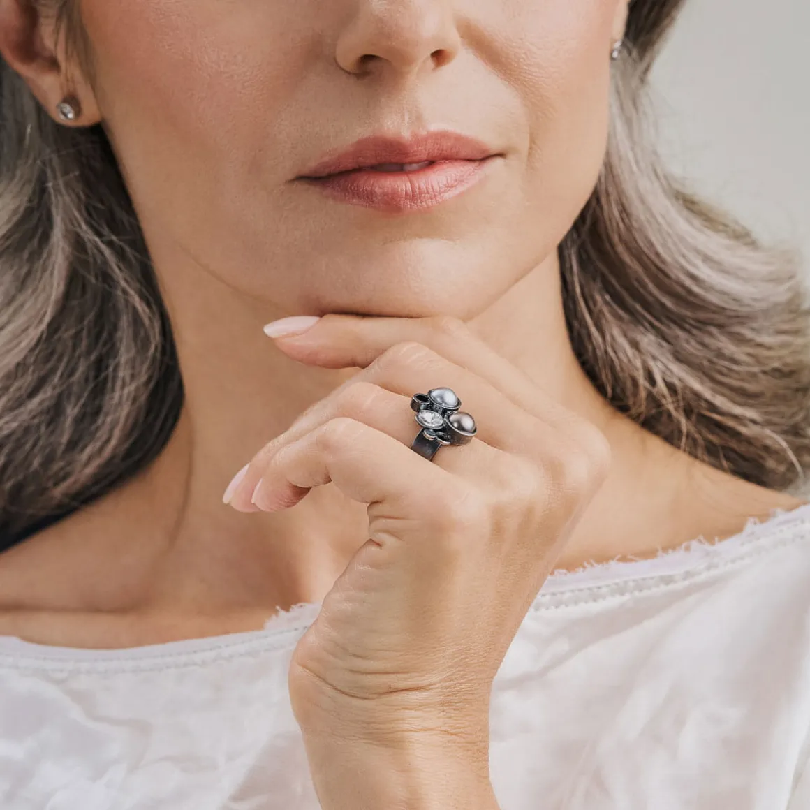 Kolekcja Soda to subtelny flirt klasyki z nowoczesnością. Artystyczny pierścionek został wykonany ręcznie z oksydowanego srebra. Tradycyjną, elegancką obrączkę ubogacono ozdobą wykonaną w technologii druku 3D. Mosiężne bąbelki wypełnione są kryształami i perłami Swarovski Elements, które dodają całości nowoczesnego sznytu. Wyrazista biżuteria będzie idealną ozdobą dla wielbicieli nieoczywistych rozwiązań, spragnionych unikalnych doznań estetycznych.