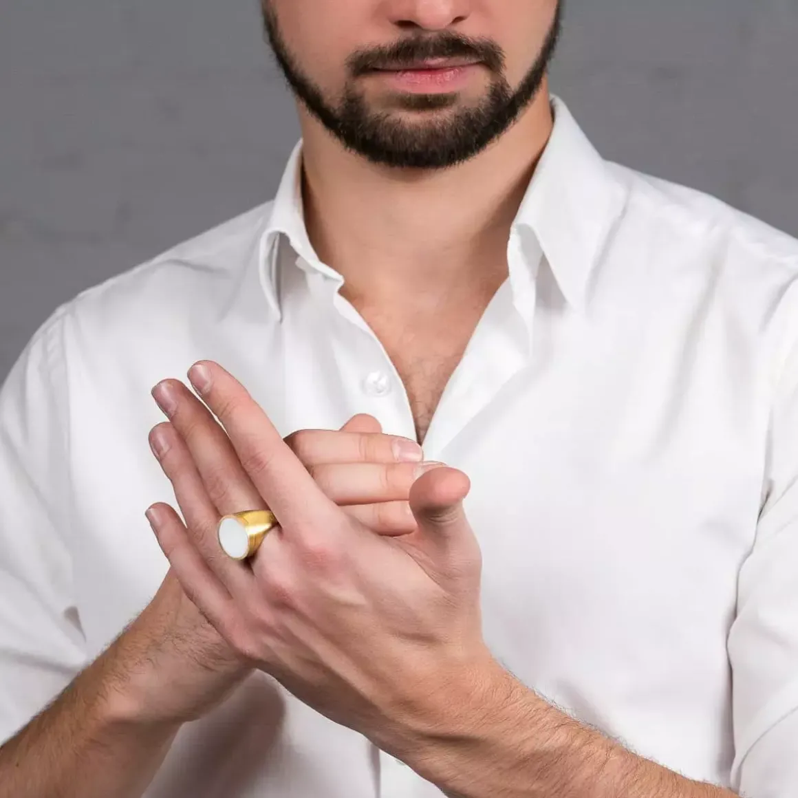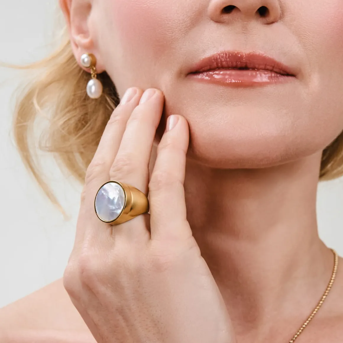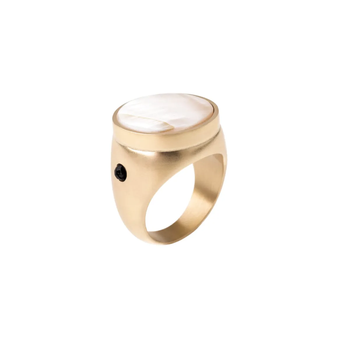 Artystyczny sygnet powstał poprzez osadzenie okrągłej masy perłowej w pozłacanej formie. Pierścionek o satynowej powierzchni ozdobiony został małym kryształem, który umieszczono z boku. Oryginalna biżuteria dzięki geometrycznej formie i połączeniu kontrastujących kolorów ma minimalistyczny charakter. Pierścionek przyciąga uwagę i jest najlepszym dowodem na to, że przeciwieństwa się przyciągają.