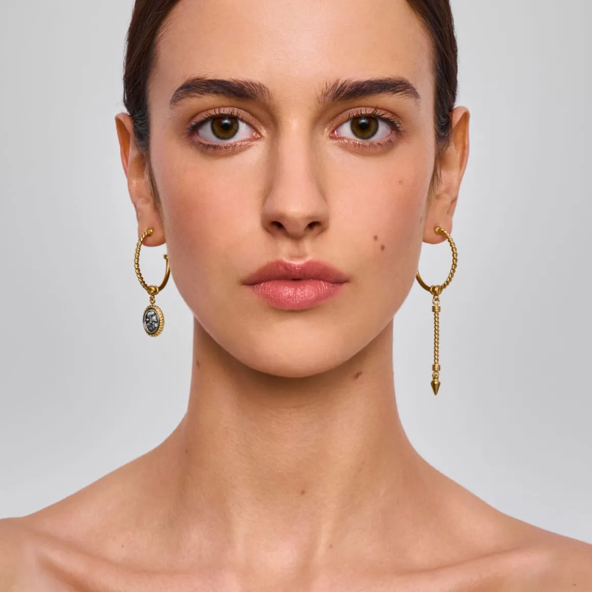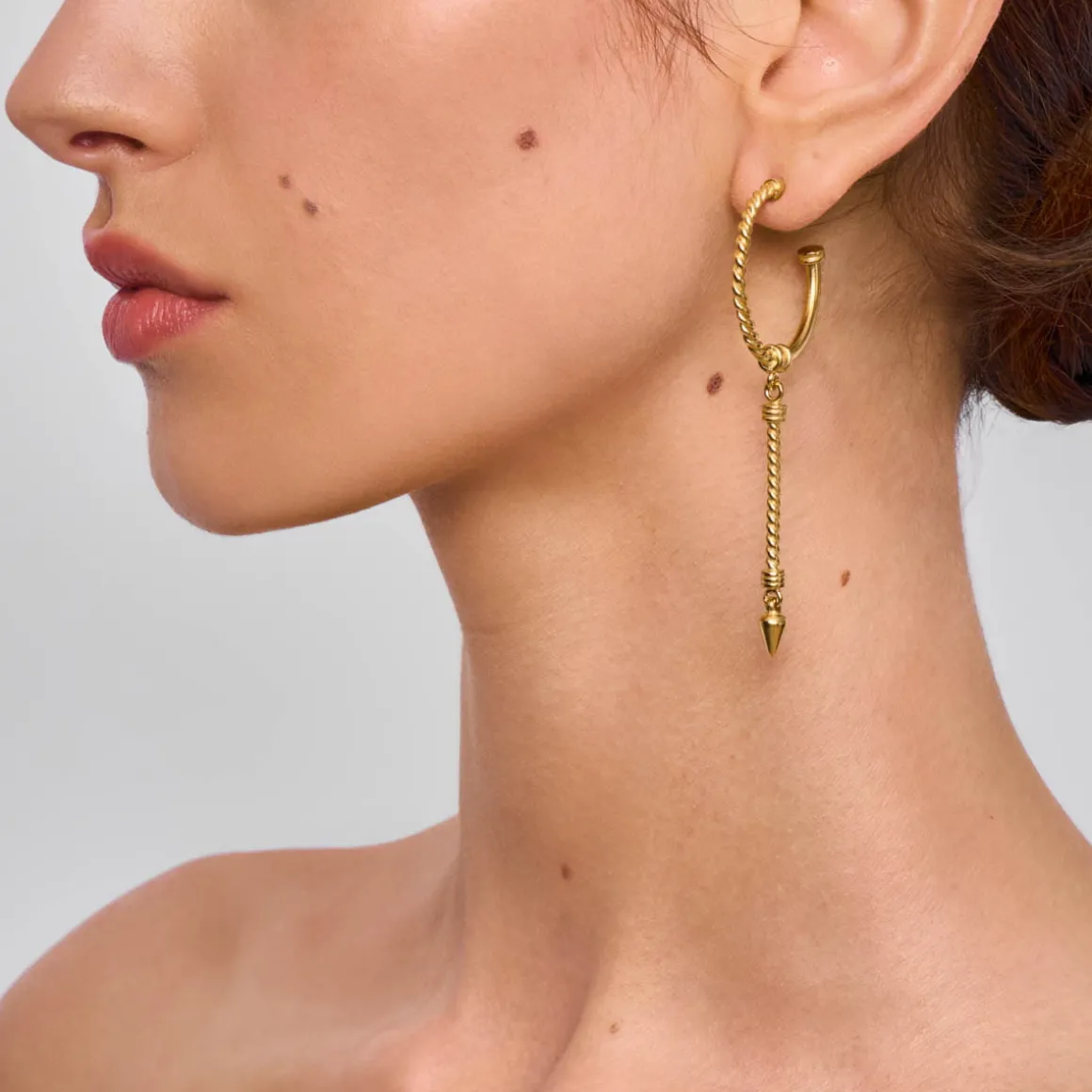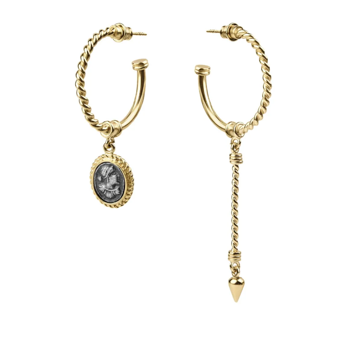 Efektowne, asymetryczne kolczyki wykonane zostały z pozłacanego mosiądzu i uformowane w duże, do połowy plecione koła. Każdy z kolczyków ozdobiony jest inną zawieszką. Do jednego z nich został przytwierdzony fragment medalionu ze srebra oksydowanego, przedstawiający figurę króla. Medalion zanurzony jest w pozłacanej, spiralnie zdobionej oprawie. Drugi kolczyk z pary ma podwieszoną smukłą strzałę. W biżuterii z kolekcji Semios ciepły, złoty kolor mosiądzu odważnie kontrastuje z oksydowanym srebrem tworząc kompozycję, która przyciąga spojrzenia i kradnie komplementy.