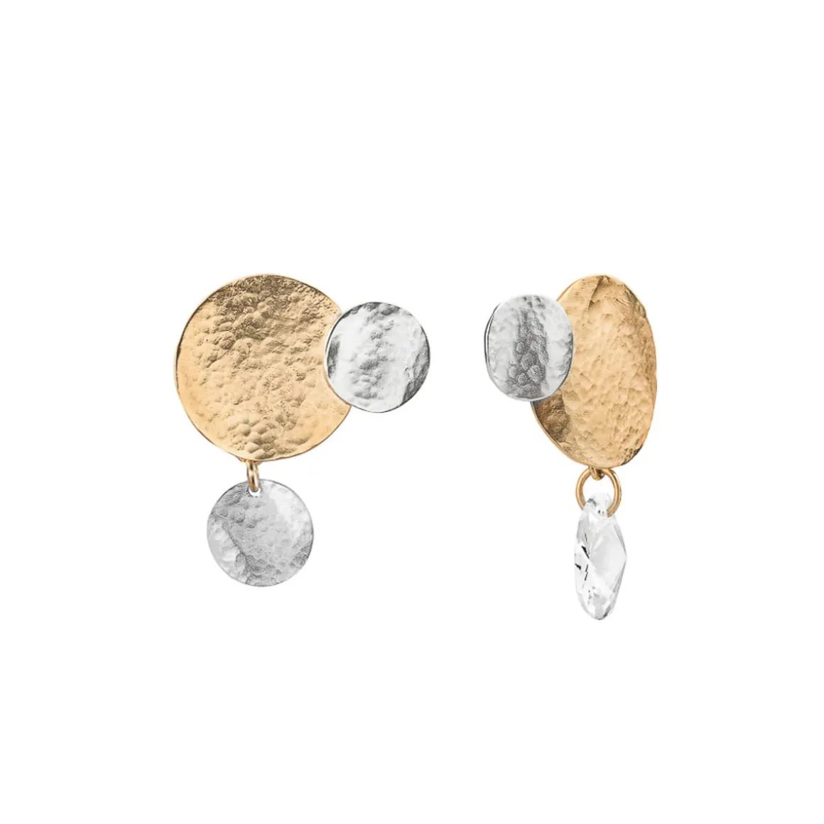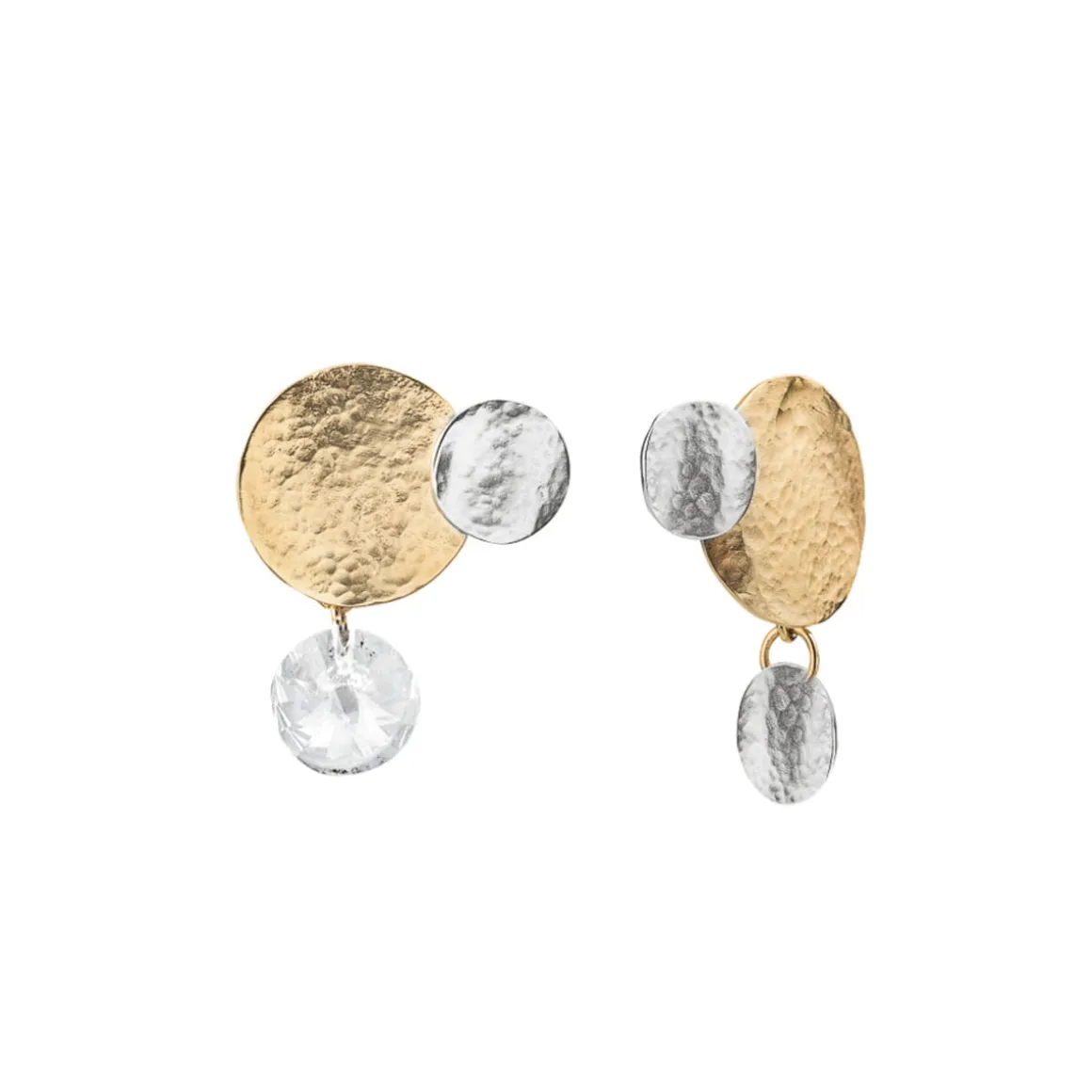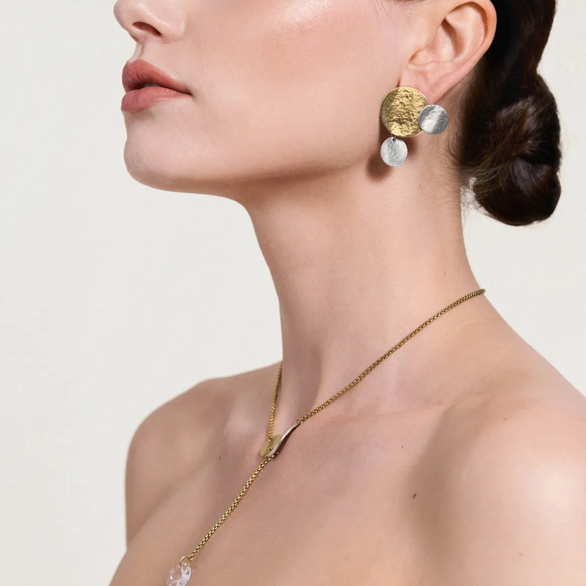 Kolczyki powstały dzięki ręcznej pracy jubilerów w warsztacie ORSKA. Są asymetryczne. W jednym kolczyku największy dysk z pozłacanego mosiądzu uzupełniają dwa mniejsze wykonane ze srebra. W drugim centralny pozłocony element udekorowany jest okręgiem wykonanym ze srebra oraz fasetowanym, bezbarwnym kryształem. Całość elementów układa się w literę L. Pofalowana struktura i kuta powierzchnia metalu nawiązuje do głównej inspiracji, która zapoczątkowała powstanie kolekcji Rundo – żywiołu wody. Kontrastowa gra kolorów oraz asymetryczna forma zwracają uwagę i nie pozwalają obojętnie przejść obok kolczyków.