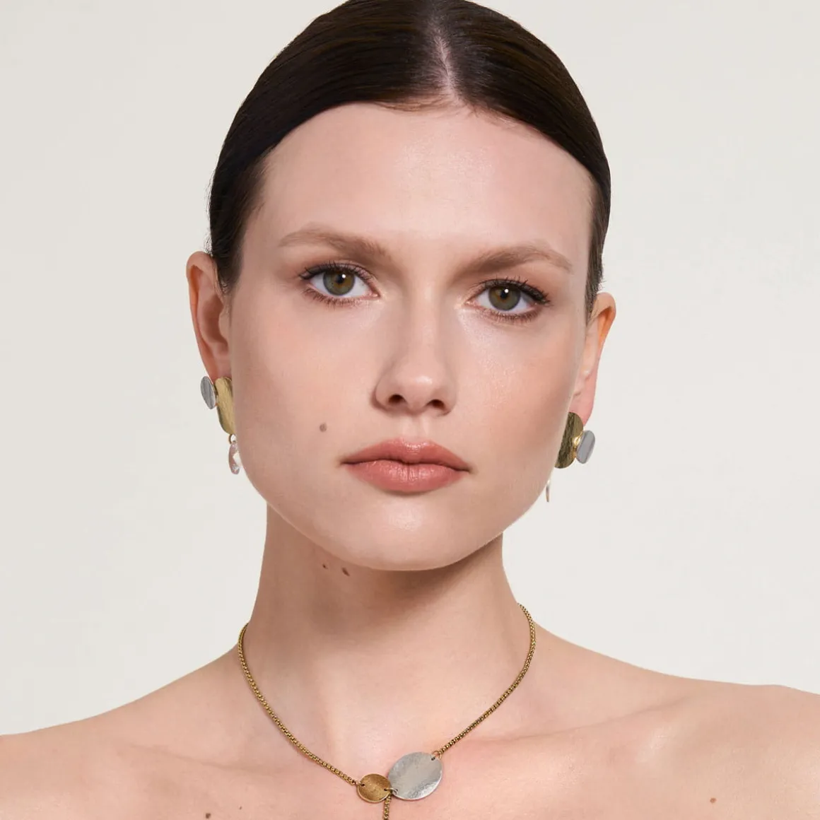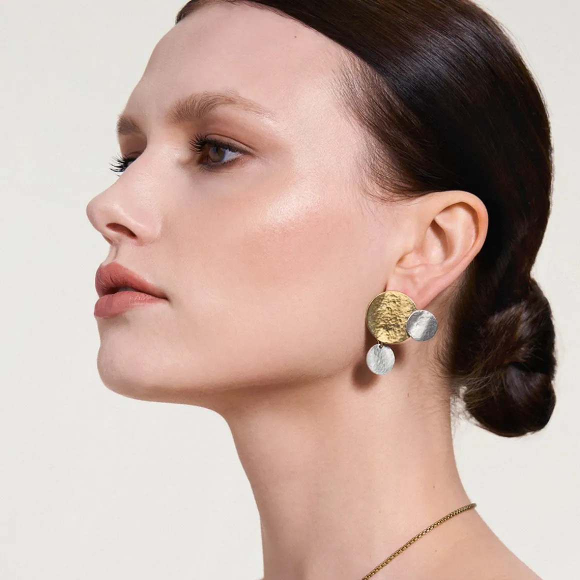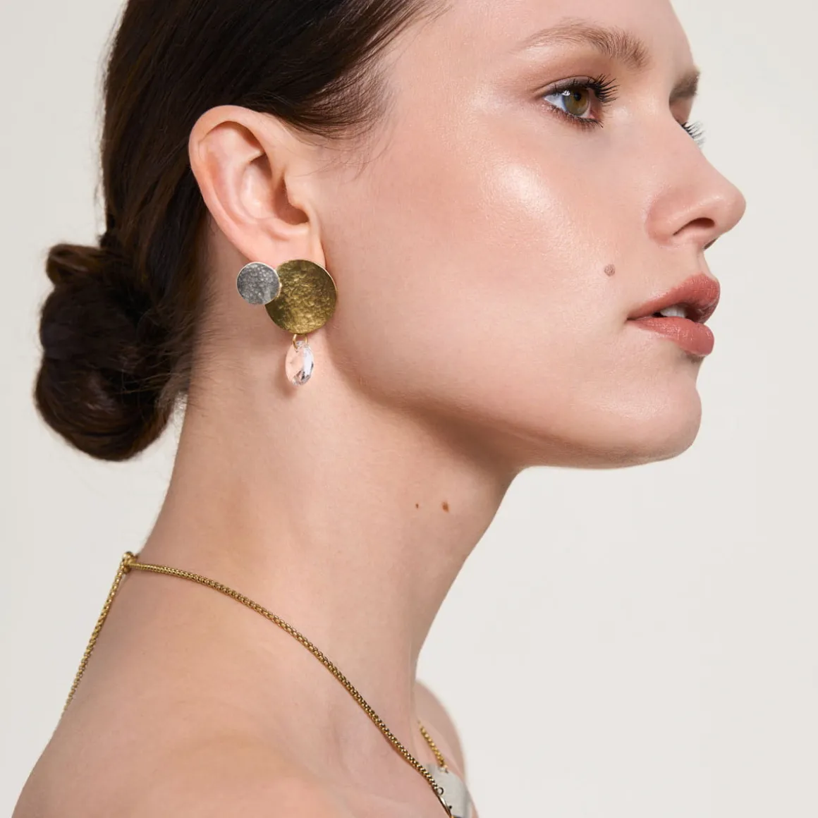 Kolczyki powstały dzięki ręcznej pracy jubilerów w warsztacie ORSKA. Są asymetryczne. W jednym kolczyku największy dysk z pozłacanego mosiądzu uzupełniają dwa mniejsze wykonane ze srebra. W drugim centralny pozłocony element udekorowany jest okręgiem wykonanym ze srebra oraz fasetowanym, bezbarwnym kryształem. Całość elementów układa się w literę L. Pofalowana struktura i kuta powierzchnia metalu nawiązuje do głównej inspiracji, która zapoczątkowała powstanie kolekcji Rundo – żywiołu wody. Kontrastowa gra kolorów oraz asymetryczna forma zwracają uwagę i nie pozwalają obojętnie przejść obok kolczyków.