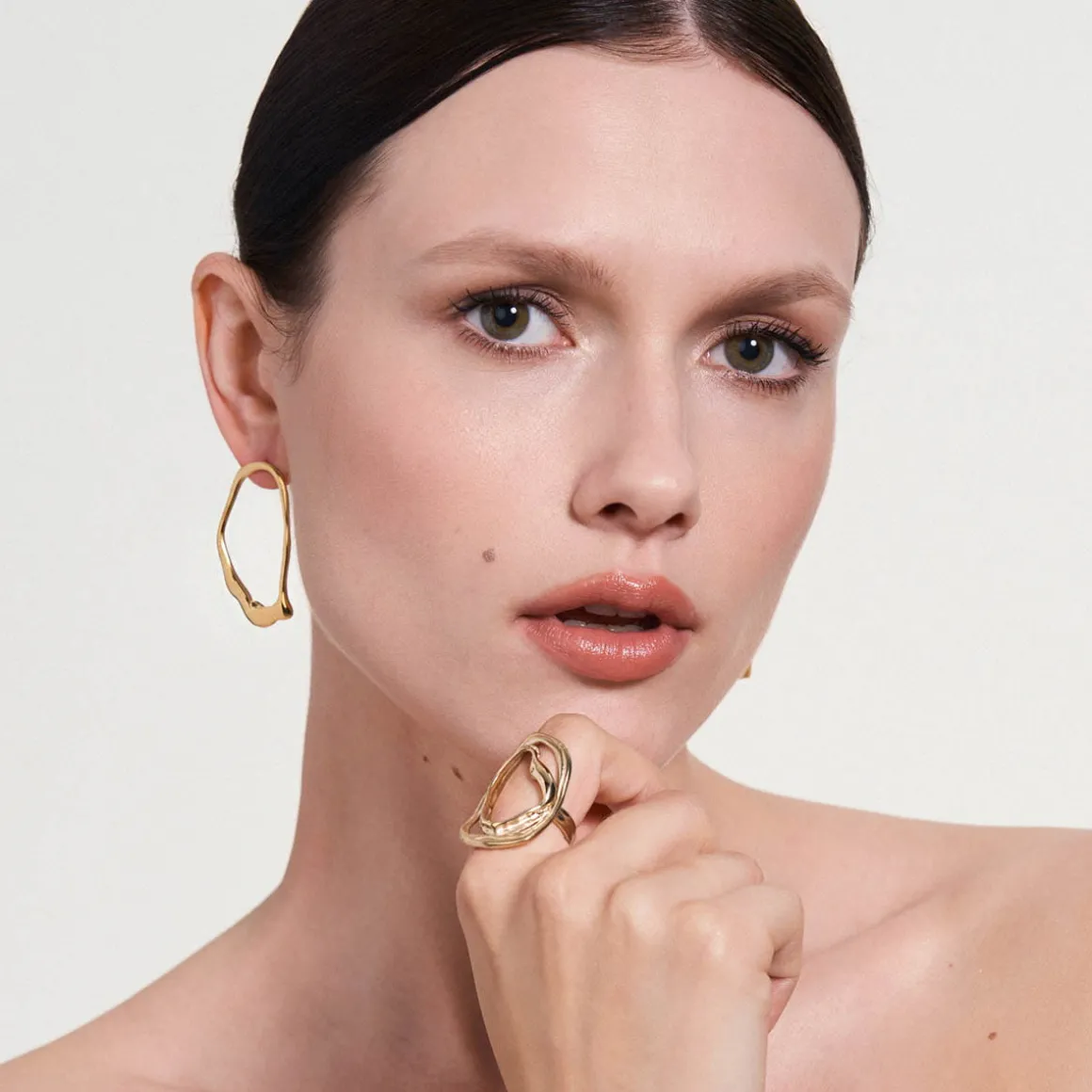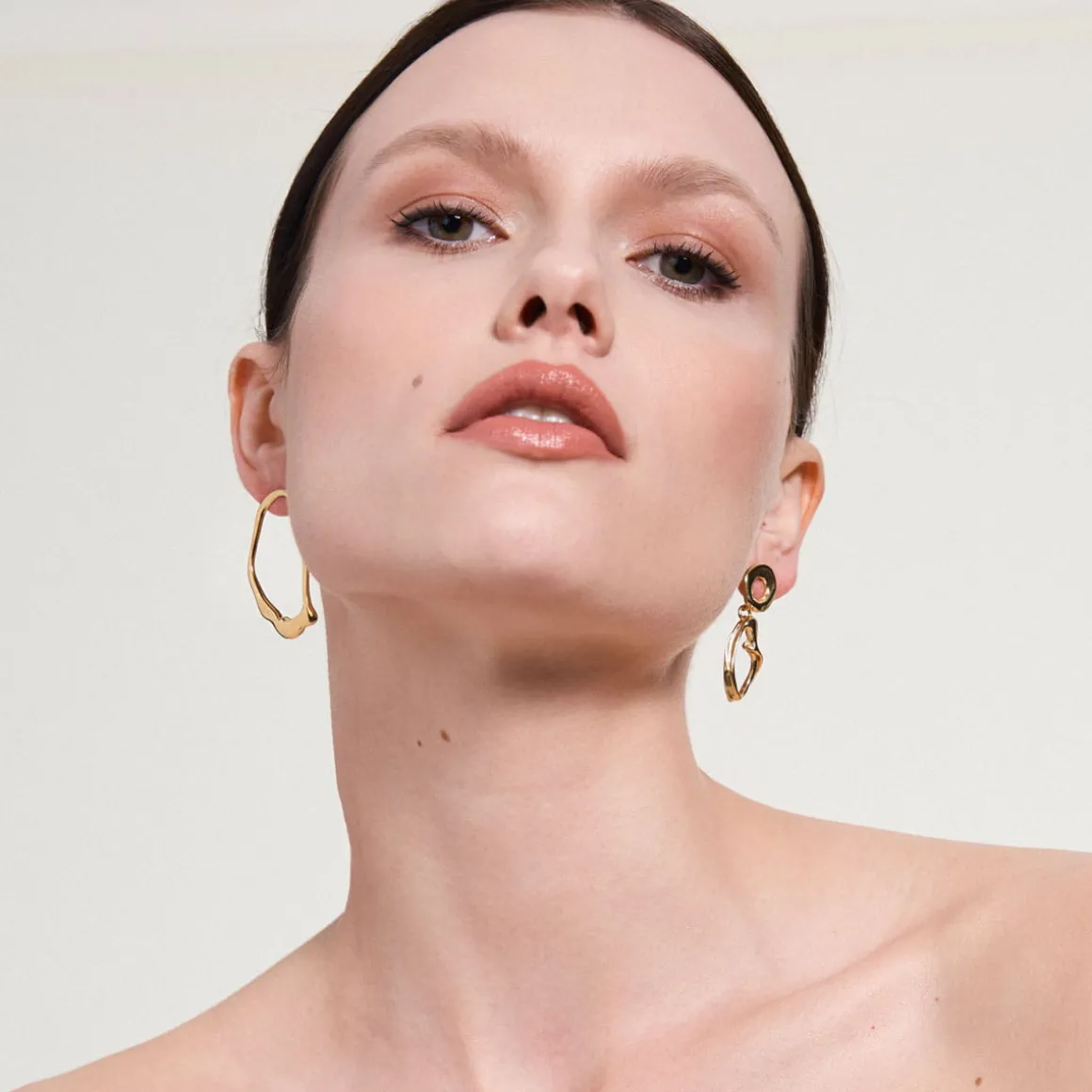 Niesymetryczne kolczyki na sztyfcie z kolekcji New Stone zostały ręcznie wykonane z pozłacanego mosiądzu. Okręgi o nieregularnym kształcie oraz połączenie połysku z matem utworzyły interesującą formę, która przyciąga uwagę. Surowa, nieidealna faktura mosiądzu przywodzi na myśl skojarzenia naturalnych, chropowatych powierzchni skalnych, co podkreśla niebanalny charakter całości. Kolczyki sprawdzą się zarówno w casualowych jak i wieczorowych stylizacjach.