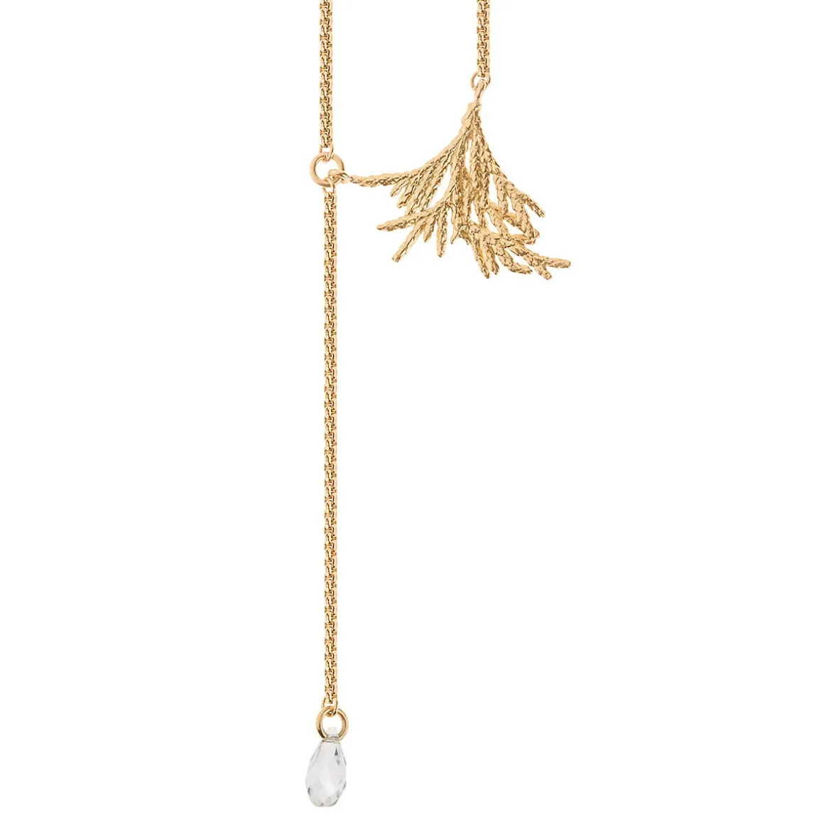Delikatny naszyjnik został stworzony ręcznie w pracowni ORSKA. Jubilerzy wiernie przenieśli charakterystyczną fakturę i ażurową formę naturalnych gałązek do świata biżuterii. Na delikatnym łańcuszku zawieszony został fragment rośliny, wyglądający jak żywa gałązka zanurzona w złotym metalu. Przedłużenie łańcuszka zdobi transparentny kryształ w kształcie kropli. Całość tworzy asymetryczną, intrygującą kompozycję. Fasetowana kropla mieni się w słońcu rozświetlając każdą stylizację.