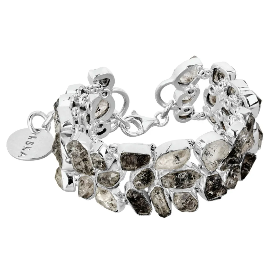 Efektowna bransoletka powstała z połączenia łupanych fragmentów kryształów górskich tzw. herkimerów. Ten kamień o transparentnej barwie zachwyca naturalnym szlifem, nieregularną formą i barwnymi inkluzjami, które dodają mu charakteru. Kamienne bryłki zostały indywidualnie oprawione w srebro, by podkreślić nieregularny, pierwotny kształt kamienia. To wyjątkowe podejście wyróżnia kolekcję, bo w jubilerstwie zazwyczaj stosuje się ustandaryzowane oprawki. Cała kompozycja zakończona jest przedłużką z podwieszanym logo ORSKA, która umożliwia regulację długości bransoletki.