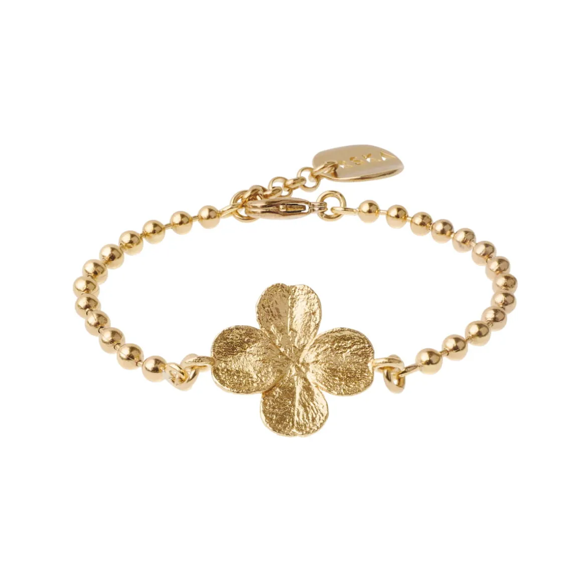 Drobna bransoletka została ręcznie wykonana z pozłacanego mosiądzu, a jej delikatny łańcuszek przyozdobiono zawieszką w kształcie czterolistnej koniczyny. Każdy listek koniczyny niesie inne dobrodziejstwo – wiarę, nadzieję, miłość i szczęście. Z tego powodu subtelna biżuteria będzie idealnym podarunkiem dla życzliwej osoby. Dzięki lekkiej, delikatnej formie bransoletka ozdobi każdą casualową stylizację.