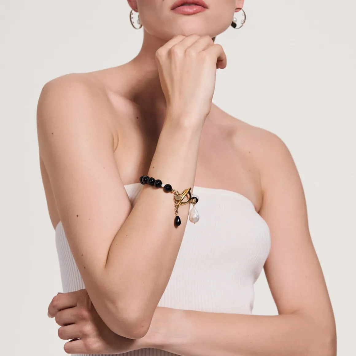Artystyczna bransoletka powstała poprzez połączenie nieregularnych pereł słodkowodnych i fasetowanych onyksów o różnych kształtach. Całość dopełnia krótki łańcuszek zakończony onyksem oraz zapięcie na ozdobny skobelek, którego miękkie linie przywodzą na myśl malarskie zdobienia art nouveau. Czarno – biała biżuteria pasuje zarówno do wieczorowej sukienki, jak i biznesowego dress codu. Kontrastowe połączenie przyciąga uwagę i jest najlepszym dowodem na to, że przeciwieństwa się przyciągają.