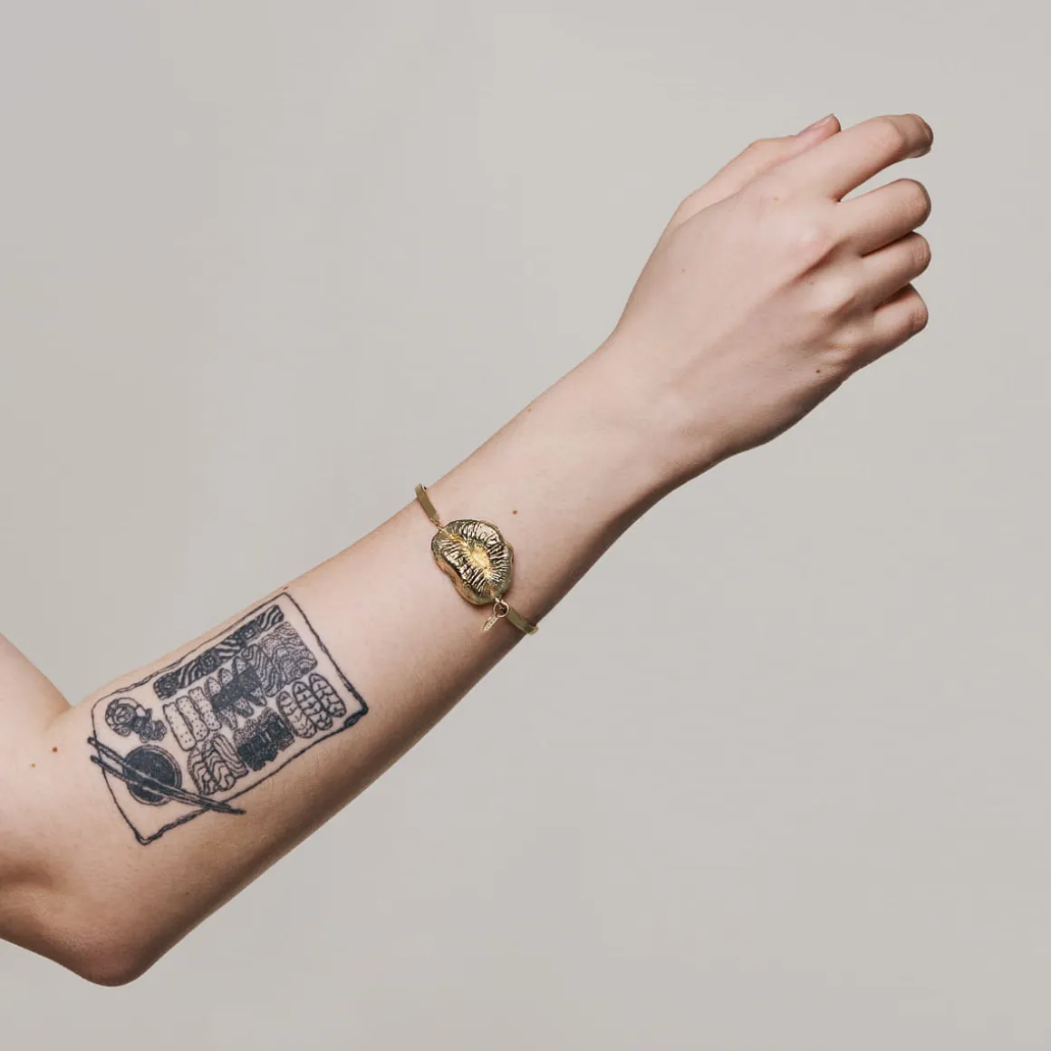 Biżuteria z kolekcji Body projektu Anny Orskiej wymaga otwartości, tak jak w rzeczywistości wymaga jej ciało, którego piękno tkwi w różnorodności. Inspiracja rzadko docenianą urodą jego bardzo funkcjonalnych fragmentów znalazła swoje ujście w hiperrealistycznych, pozłacanych formach odlanych z natury. Ręcznie wykonana, delikatna bransoletka została ozdobiona zawieszką w kształcie ust. Piękno płynące z różnorodności wyeksponowane w artystycznym, jubilerskim projekcie czyni z niego ozdobę wspierającą akceptację ludzkiej fizyczności.