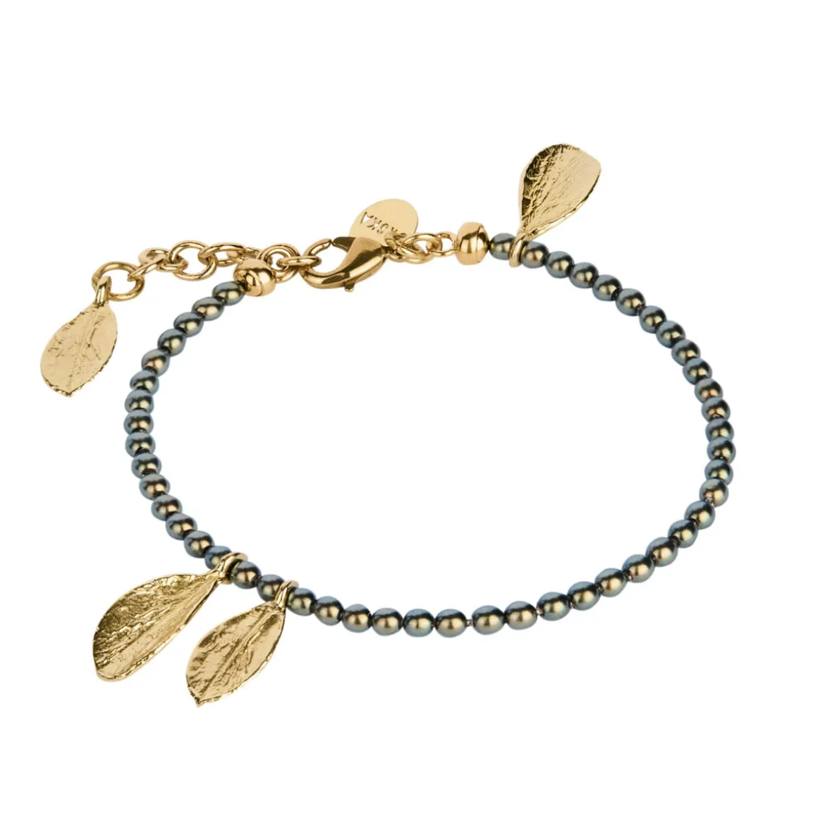 Artystyczna bransoletka z kolekcji Bery została ręcznie wykonana z zielonych kryształów oraz perełek, które dzięki połączeniu utworzyły subtelny sznur miękko oplatający nadgarstek. Całość przyozdabiają pozłacane zawieszki w kształcie liści bukszpanu rzeczywistej wielkości. Bardzo delikatna i kobieca biżuteria w romantycznym stylu będzie idealnym wyborem dla osób kochających naturę, które nieustannie czerpią z niej siłę i inspirację.