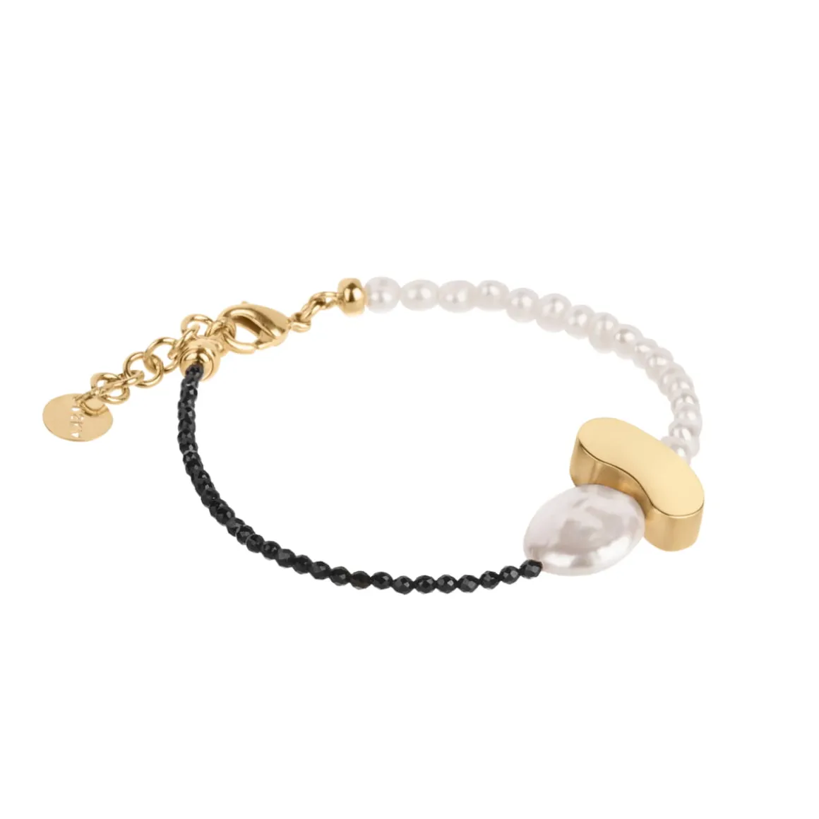 Delikatna bransoletka powstała poprzez połączenie nieregularnych pereł słodkowodnych i drobnych onyksów. Biżuteria ozdobiona została pozłacanym elementem o miękkim, abstrakcyjnym kształcie, który został połączony z większą perłą. Czarno – biała bransoletka ma uniwersalny charakter, dzięki czemu dobrze prezentować się będzie zarówno w towarzystwie wieczorowej sukienki, jak i białej koszuli czy codziennej bluzki.