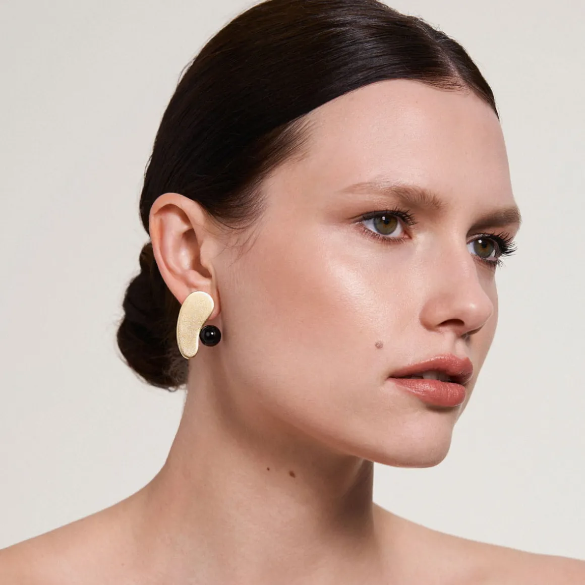 Delikatne kolczyki zostały wykonane ręcznie. Miękkie, nieregularne kształty odlane w pozłacanym mosiądzu ozdobione zostały okrągłymi onyksami. Sztyfty wykonano ze srebra. Całość utworzyła kompozycję, przypominającą zdobne ornamenty art nouveau. Biżuteria, mimo niewielkich rozmiarów, jest elegancka i bardzo zdobna. Kolczyki wraz z bransoletką z onyksami i perłami utworzą duet, który skradnie mnóstw komplementów.