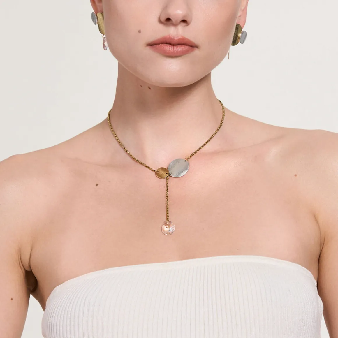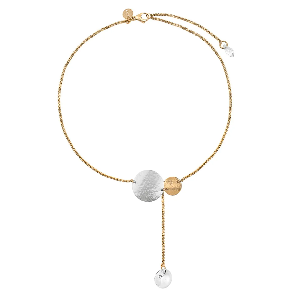 Artystyczny naszyjnik z kolekcji Rundo został wykonany ręcznie z pozłacanego mosiądzu i srebra. Delikatny łańcuszek o splocie kostki zdobią dwie kryształowe zawieszki: jedna z przodu i druga z tyłu. Kompozycję zamyka małe logo ORSKA oraz zapięcie na karabińczyk. Okrągłe formy i kuta ręcznie powierzchnia oddają symbolikę żywiołu wody będącego tematem kolekcji Rundo. Choć naszyjnik doskonale prezentuje się solo, lubi też towarzystwo pozostałych wzorów z kolekcji Rundo – szeroka bransoleta typu mankiet lub pierścionek z dwoma, metalicznymi oczkami utworzą wraz z nim duet, obok którego nie da się przejść obojętnie.