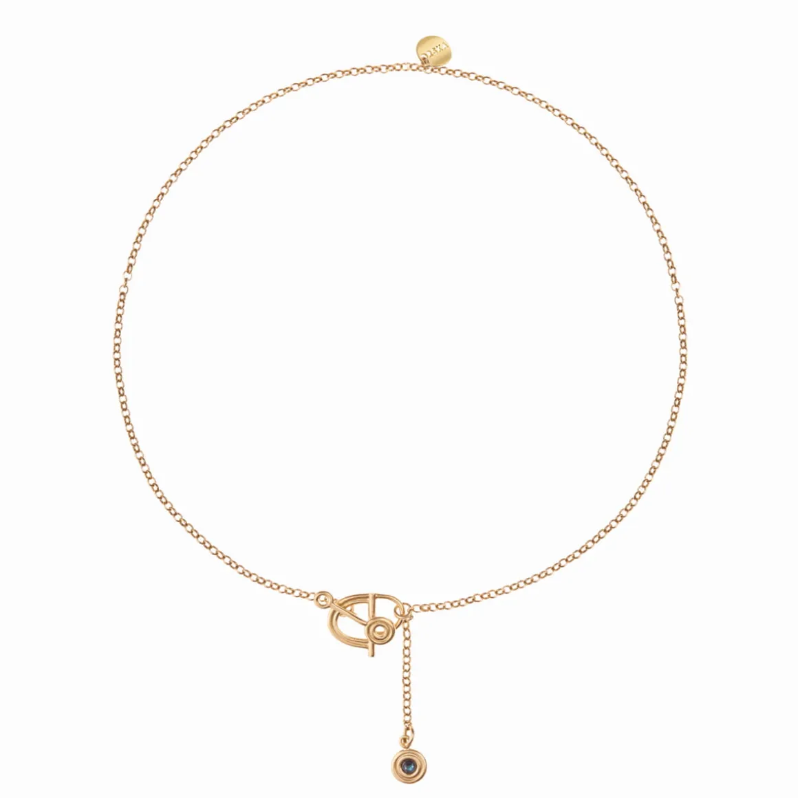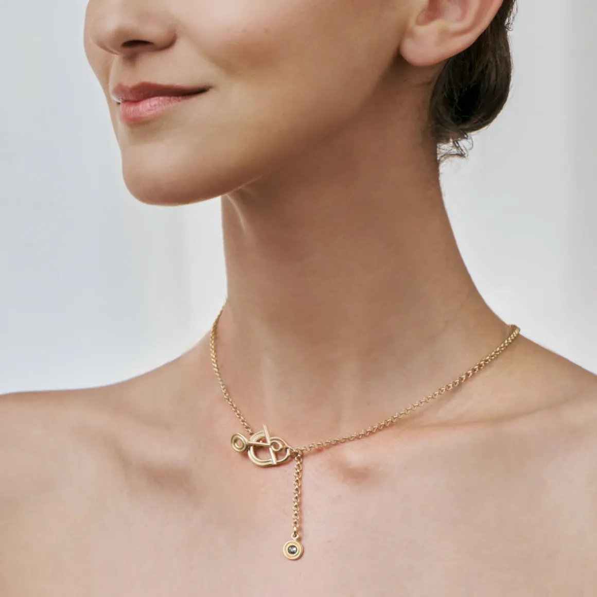 Artystyczny naszyjnik z kolekcji Holos został wykonany ręcznie z pozłacanego mosiądzu. Delikatny łańcuszek zdobi zawieszka będąca jednocześnie zapinką na skobel, małe logo ORSKA oraz zawieszony na łańcuszku kryształ. Fantazyjne formy i linearne zdobienie zawieszki oddają symbolikę żywiołów. Symbol powietrza ma kształt nieustannie pędzącego łuku. Znak wody zainspirowany okręgami powstającymi na zakłóconej tafli jeziora uzupełniają kryształy w kolorze szafirowego granatu i grafitu. Biżuteria z kolekcji Holos, przedstawiając współpracę żywiołów, zachęca byśmy docenili zespołową istotę natury. Choć naszyjnik doskonale prezentuje się solo, lubi też towarzystwo pozostałych wzorów z kolekcji Holos – szeroka bransoleta w złotym kolorze lub pierścionek na dwa palce utworzą wraz z nim duet, obok którego nie da się przejść obojętnie.