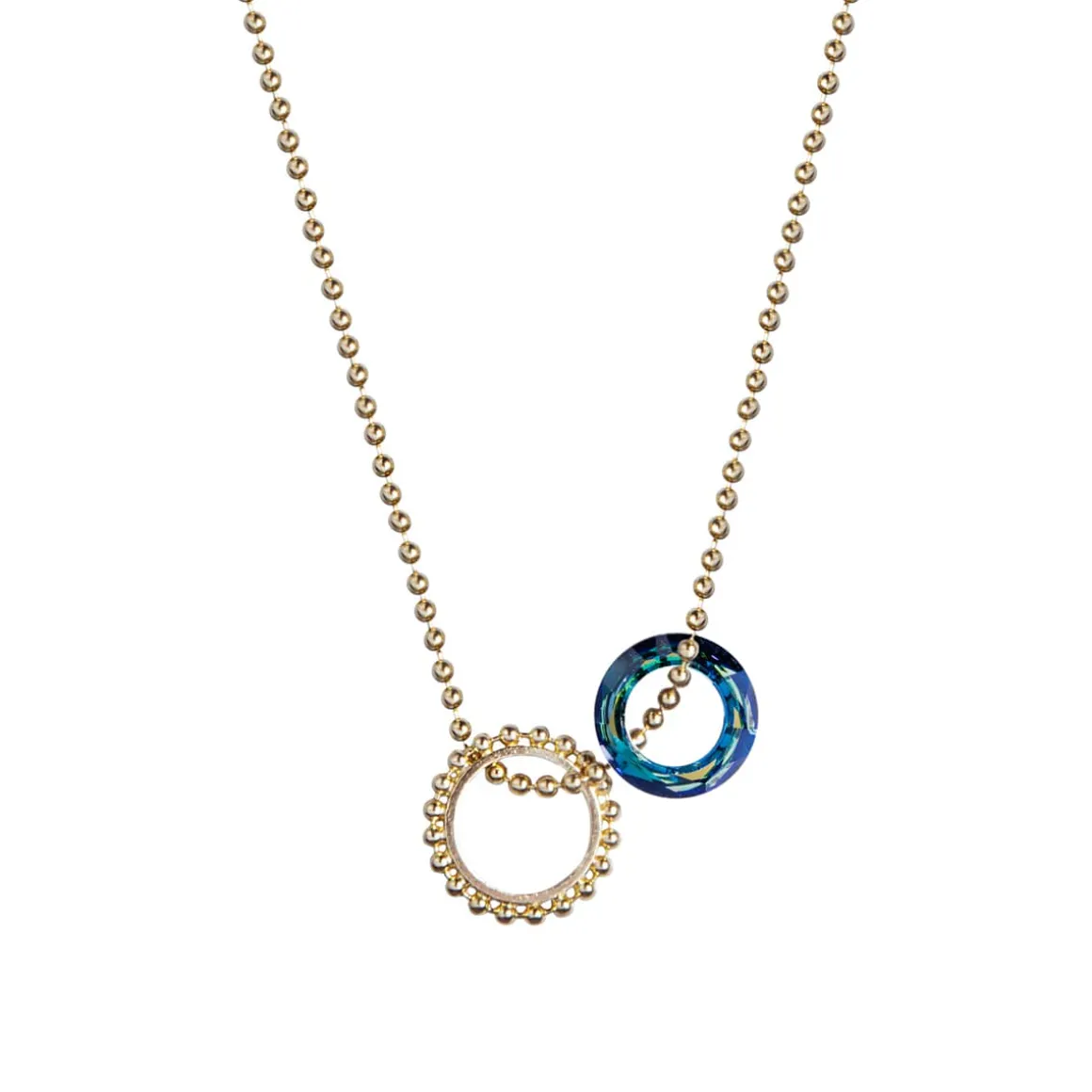 Subtelny naszyjnik z kolekcji Ray został wykonany ręcznie z pozłacanego mosiądzu. Krótki kulkowy łańcuszek został ozdobiony dwoma okrągłymi zawieszkami o różnej wielkości. Jedną z nich jest kryształ Swarovski Elements. Naszyjnik dzięki swojemu uniwersalnemu charakterowi i eleganckiej formie będzie doskonałym dodatkiem zarówno do codziennych, jak i wieczorowych stylizacji. Minimalistyczny design dobrze komponuje się również z kolczykami i bransoletką z kolekcji Ray.
