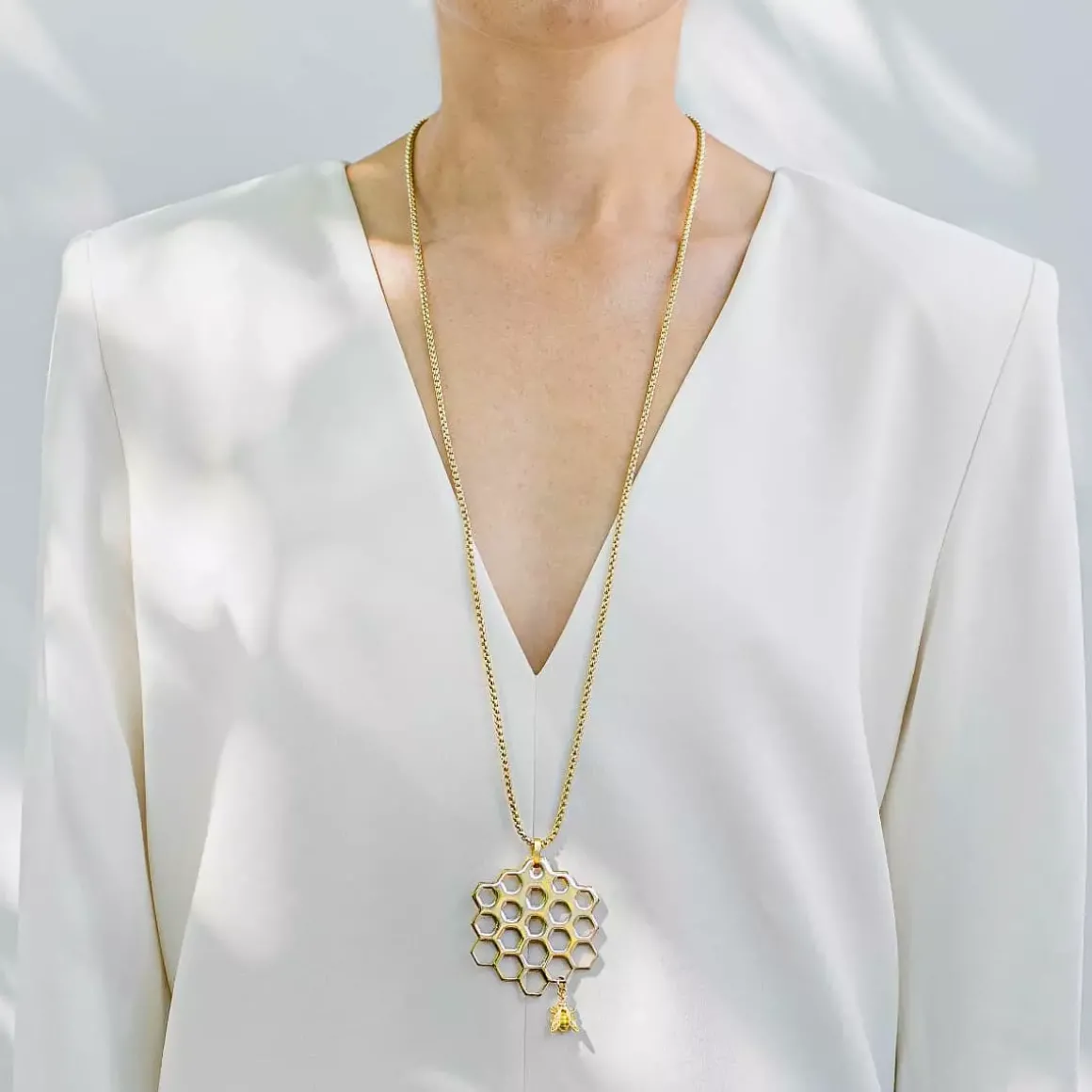 Artystyczny, ręcznie wykonany naszyjnik z kolekcji Apis został zainspirowany niestrudzoną pracą pszczół i ich perfekcyjnymi dziełami. Te pożyteczne owady stojące na straży naszego ekosystemu to jednocześnie wybitni inżynierowie, których precyzji niełatwo dorównać. ORSKA podjęła wyzwanie, projektując ażurowe elementy inspirowane plastrami miodu. Geometryczny, heksagonalny wisior został dodatkowo ozdobiony symboliczną pszczółką stworzoną z wykorzystaniem technologii druku 3D. Minimalistyczny design naszyjnika czyni go idealnym dodatkiem na co dzień. Świetnie sprawdzi się jako uzupełnienie casualowych strojów.