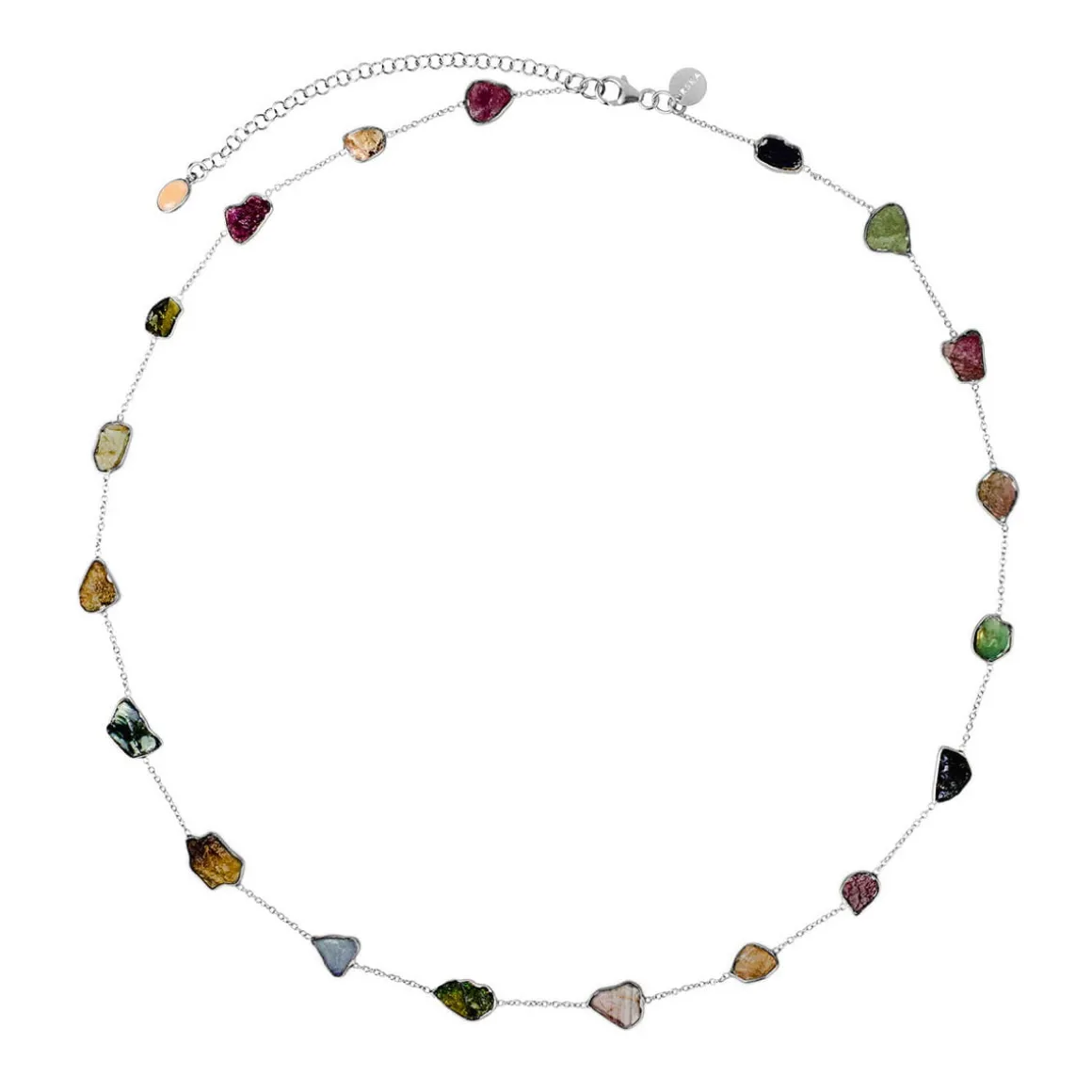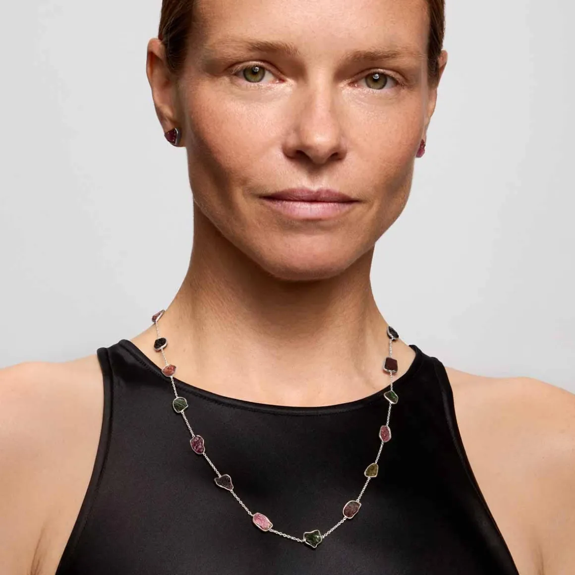 Długi naszyjnik został wykonany z surowych, płaskich fragmentów turmalinów w delikatnych ramach ze srebra próby 925. Każdy turmalin został indywidualnie oprawiony w sposób podkreślający jego surowy, asymetryczny kształt. Głębokie zielenie, różowe i piaskowe odcienie kamieni połączono subtelnym łańcuszkiem o drobnym splocie. Różnice w barwie i kształcie sprawiają, że każdy egzemplarz naszyjnika jest niepowtarzalny – tak jak niepowtarzalny jest każdy spektakl zorzy polarnej. Regulowana długość łańcuszka pozwala nosić go zarówno solo, jak i w ciekawych, warstwowych zestawieniach. Całość wieńczy przedłużka zakończona ozdobną zawieszką z owalnym turmalinem.